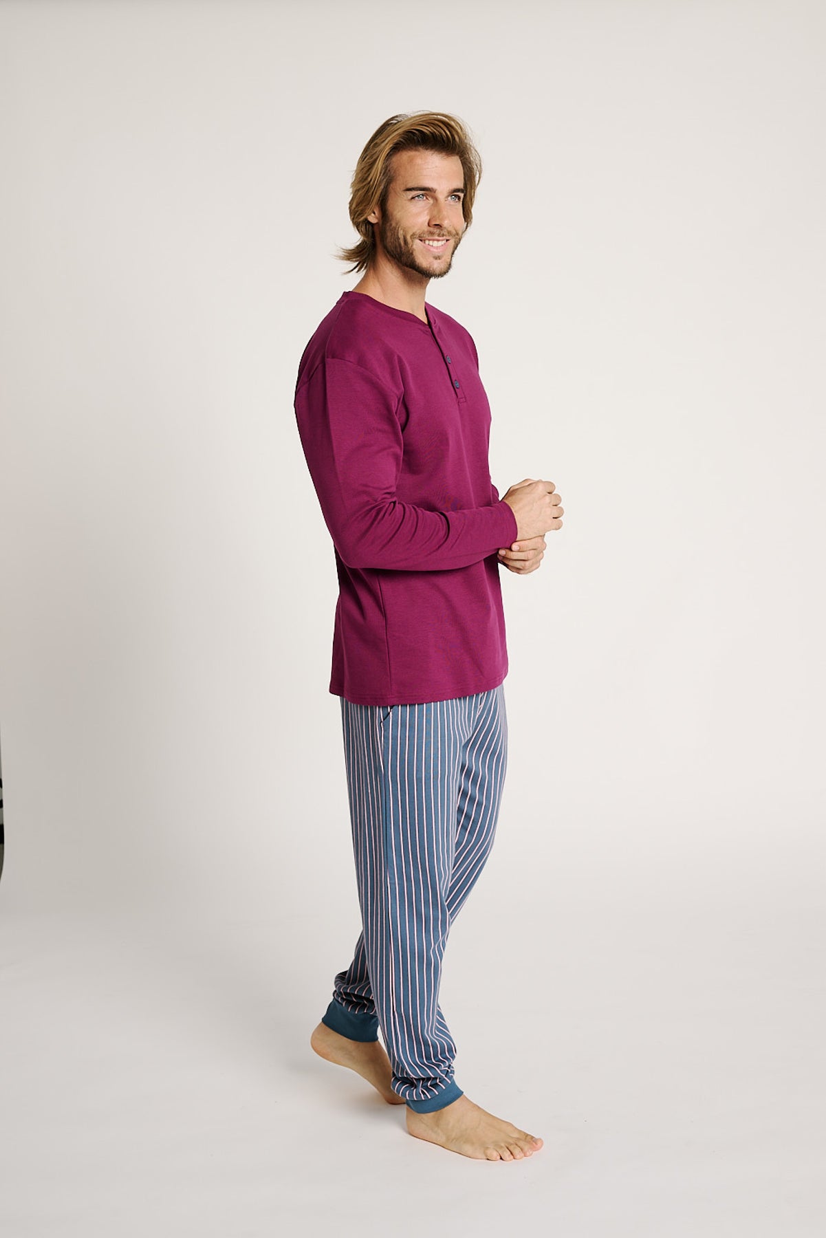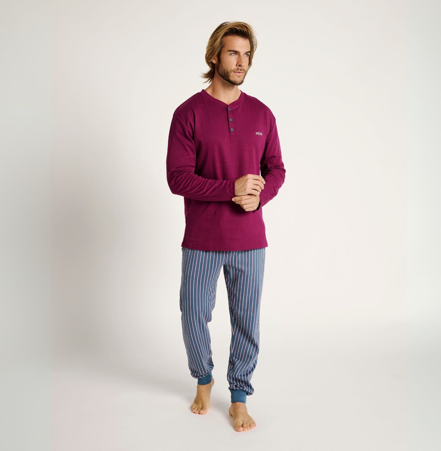 Ανδρική χειμερινή πιτζάμα της εταιρείας Muy Demi κατασκευασμένη από 100% βαμβάκι. Η μπλούζα σε μπορντό χρώμα διαθέτει λαιμόκοψη με κουμπιά για διακριτικό στιλ. Το παντελόνι σε γαλάζιο χρώμα με κάθετες ρίγες σε απαλό ροζ ολοκληρώνεται με μπάσκες στο τελείωμα για άνετη εφαρμογή. Ιδανική επιλογή για χαλαρές στιγμές και άνεση στον ύπνο.