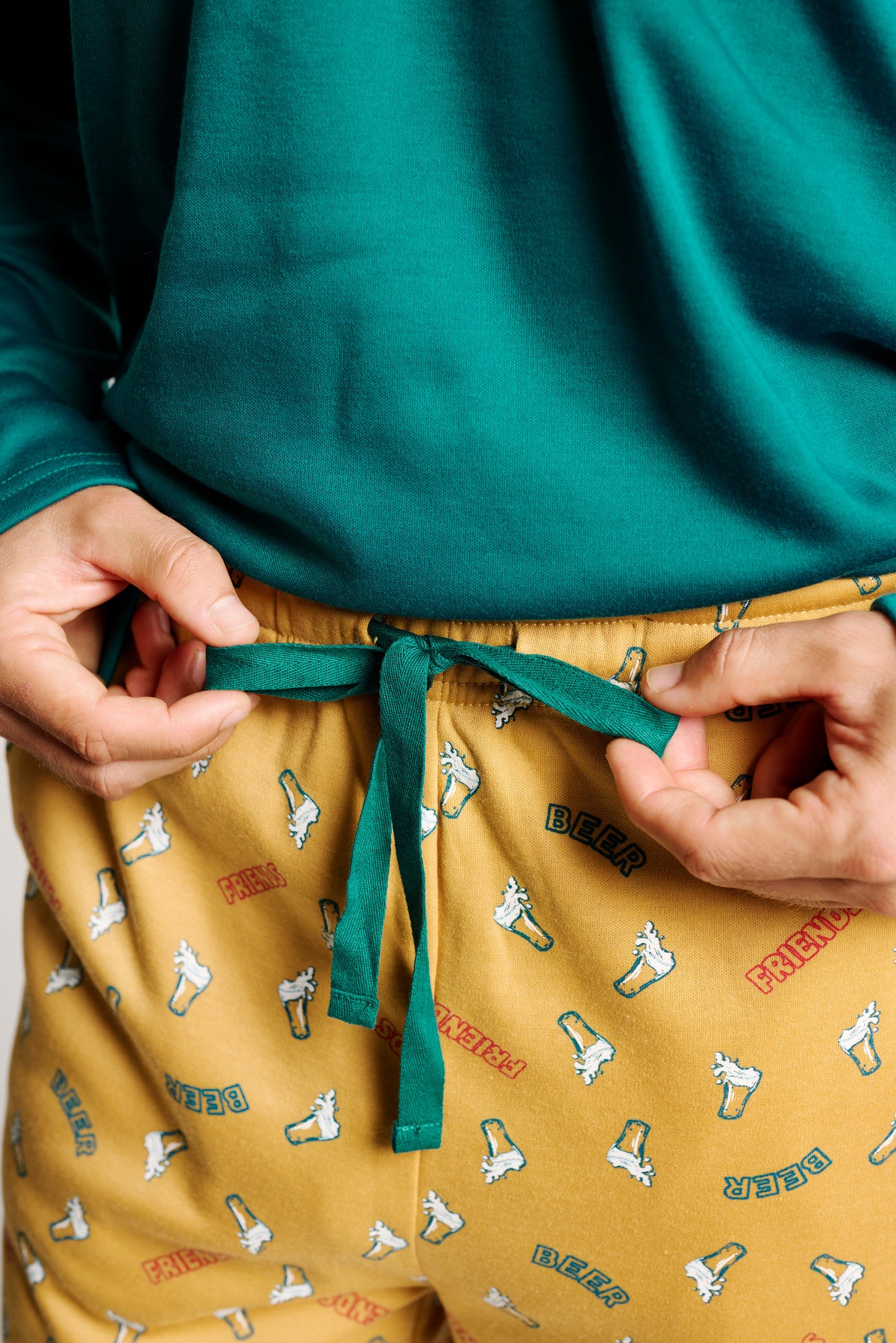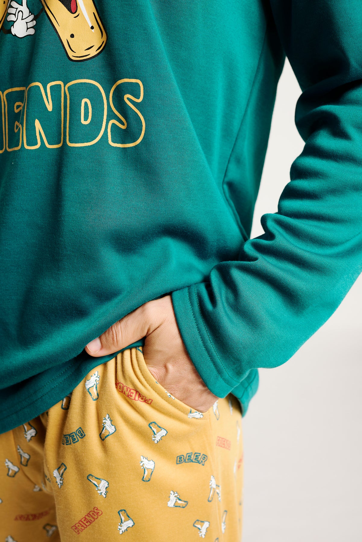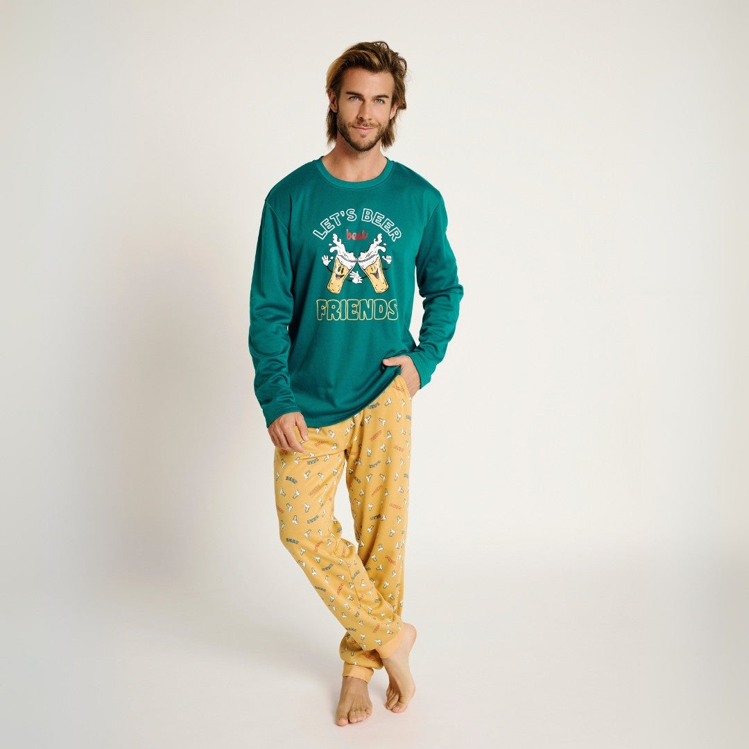 Ανδρική χειμερινή πιτζάμα της εταιρείας Muy Demi, σε τιρκουάζ απόχρωση με στάμπα “Let’s Beer Friends” στο επάνω μέρος για χιουμοριστικό και νεανικό στιλ. Το παντελόνι είναι κίτρινο με μικρά σχέδια μπύρας, χαρίζοντας χιουμοριστική διάθεση. Διαθέτει λάστιχο στη μέση και μπάσκες στα τελειώματα για σταθερή εφαρμογή. Αποτελεί μια ιδανική επιλογή για άντρες που αναζητούν άνεση και στυλ στις στιγμές χαλάρωσης.
