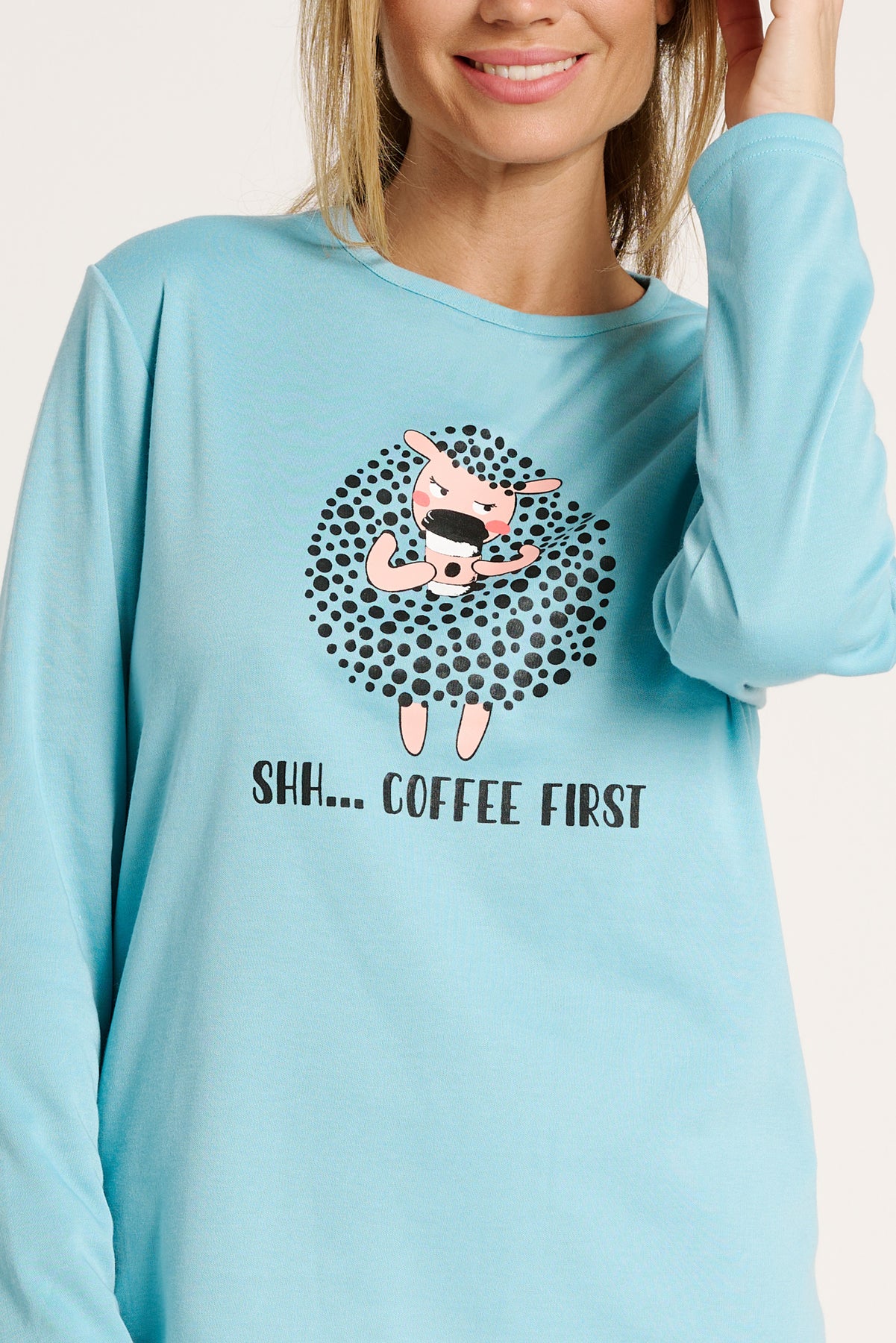 Γυναικεία χειμερινή πιτζάμα της εταιρείας Muy Demi κατασκευασμένη από 100% βαμβάκι σε ροζ-γαλάζιους τόνους με σχέδια προβατάκια. Η μπλούζα με μακρύ μανίκι διαθέτει στάμπα “Shh… Coffee First” με ένα προβατάκι, ενώ το παντελόνι έχει σχέδια προβατάκια και συνδυάζεται με κορδόνι και λάστιχο στη μέση. Οι μπασκές στα τελειώματα προσφέρουν άνεση και σταθερότητα στην εφαρμογή.