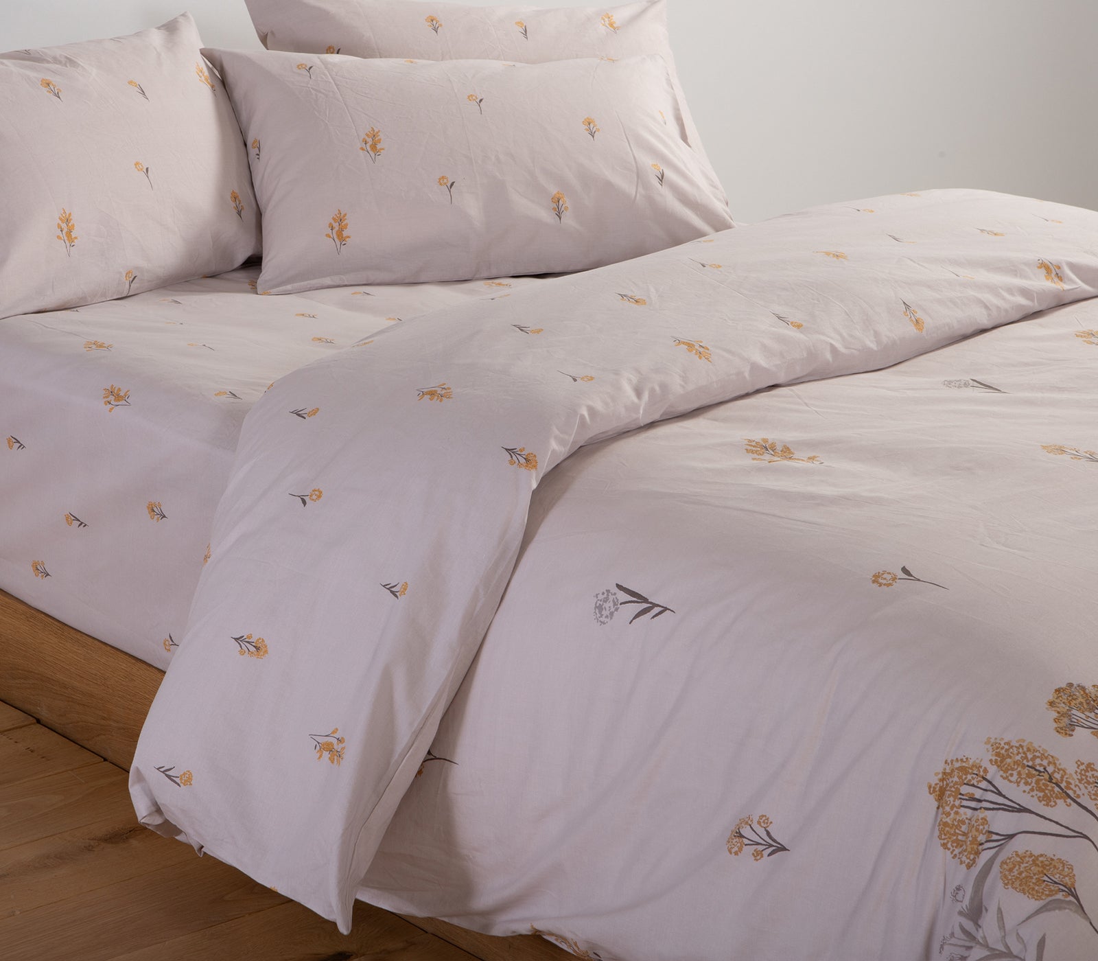 Σετ σεντονιών σε γκρι με μαξιλαροθήκες και κατωσέντονο, διακοσμημένα με κίτρινα λουλούδια, φωτογραφημένο σε λευκό φόντο.