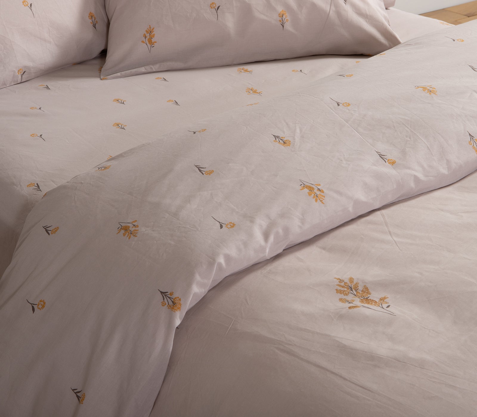 Κοντινή λήψη σε σετ σεντόνια σε απαλό γκρι με κίτρινα λουλούδια κεντημένα, μαξιλαροθήκες και κατωσέντονο.