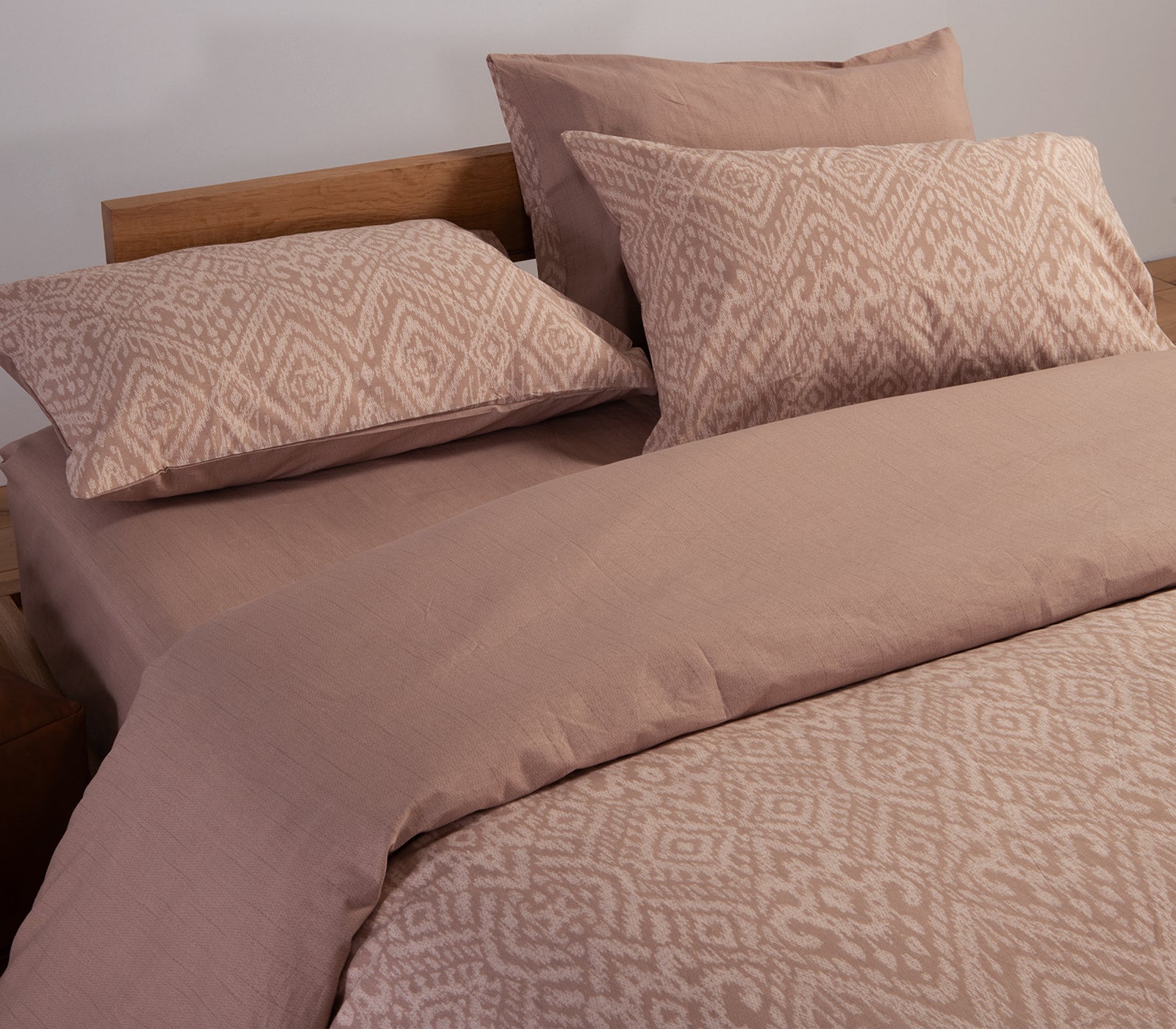 Κοντινή λήψη καφέ σετ σεντονιών με γεωμετρικά σχέδια και συνδυασμό με μονόχρωμο κατωσέντονο.