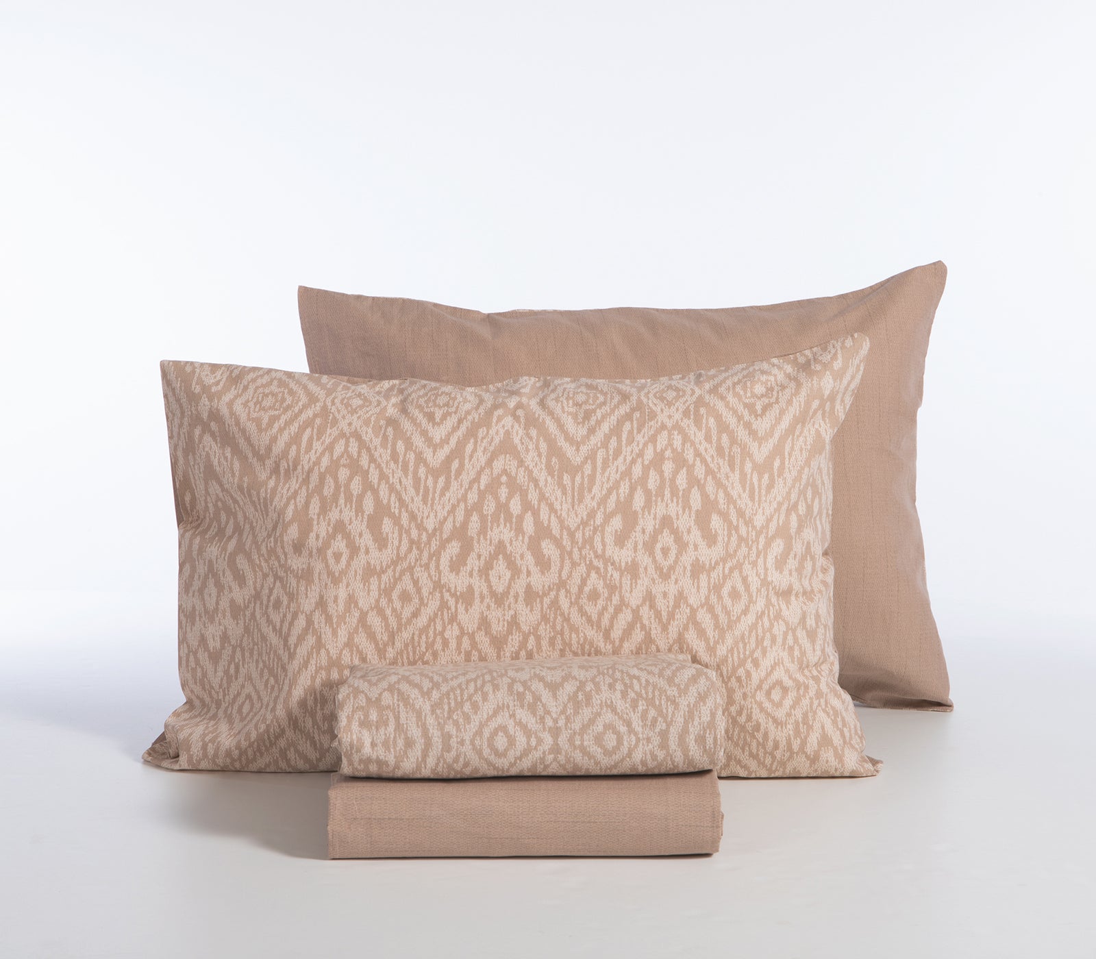 Σετ σεντόνια εμπριμέ μονά σε μπεζ απόχρωση της εταιρείας Nef-Nef Homeware με γεωμετρικό μοτίβο, κατασκευασμένο από 100% βαμβάκι. Περιλαμβάνει ένα πανωσέντονο διάστασης 170x270cm με εντυπωσιακό σχέδιο σε μπεζ τόνους και ένα κατωσέντονο με λάστιχο 100x200+35cm σε μονόχρωμο μπεζ χρώμα. Η μαξιλαροθήκη 52x72cm είναι διπλής όψης, με τη μία πλευρά να συνεχίζει το σχέδιο του πανωσέντονου και την άλλη του κατωσέντονου. Ιδανική επιλογή για όσους αγαπούν την ισορροπία ανάμεσα στην απλότητα και την προσωπικότητα στο υπνοδωμάτιο.