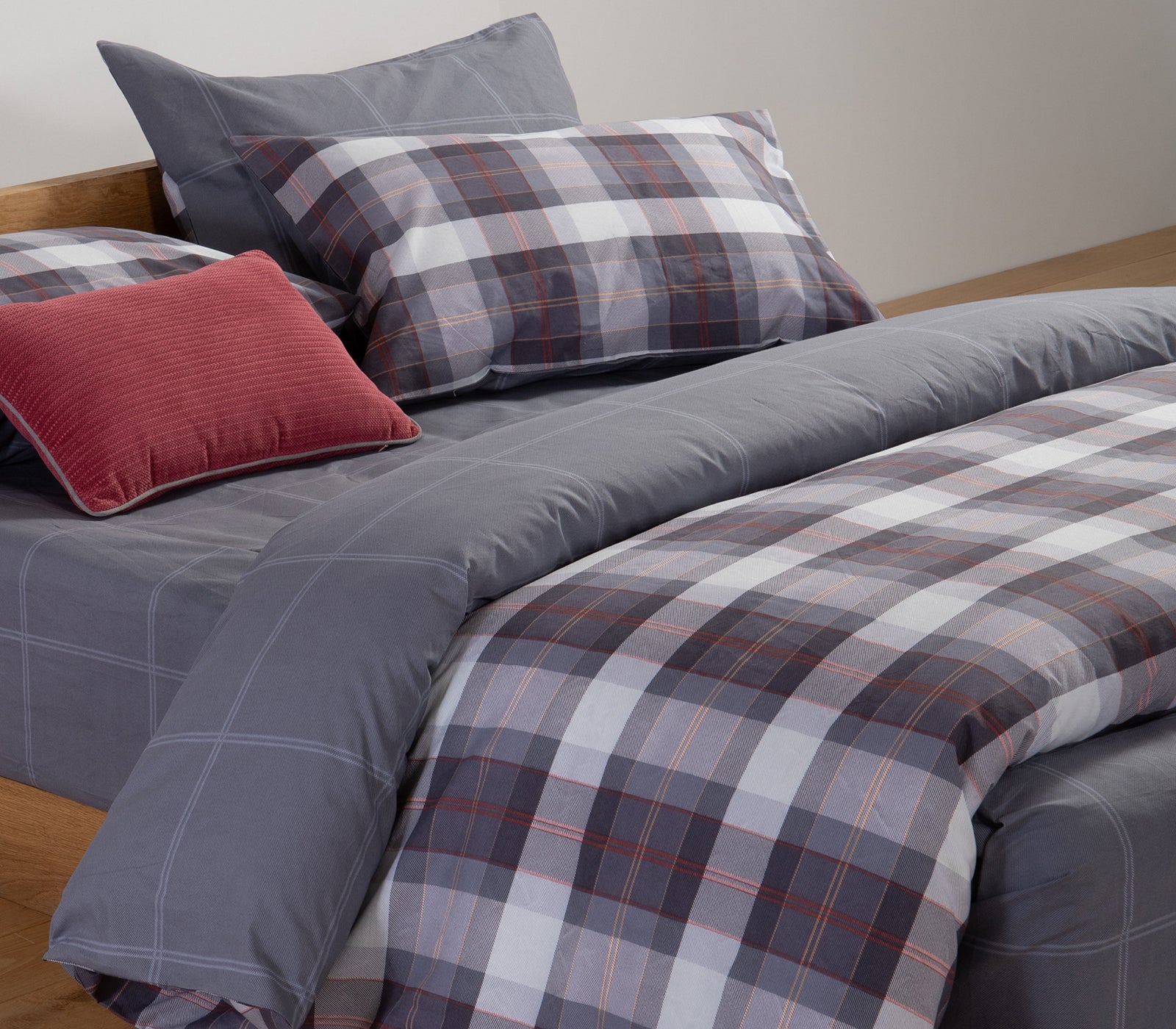 Σετ σεντόνια γκρι με καρό σχέδιο σε λευκό φόντο, διπλωμένα με μαξιλαροθήκες.