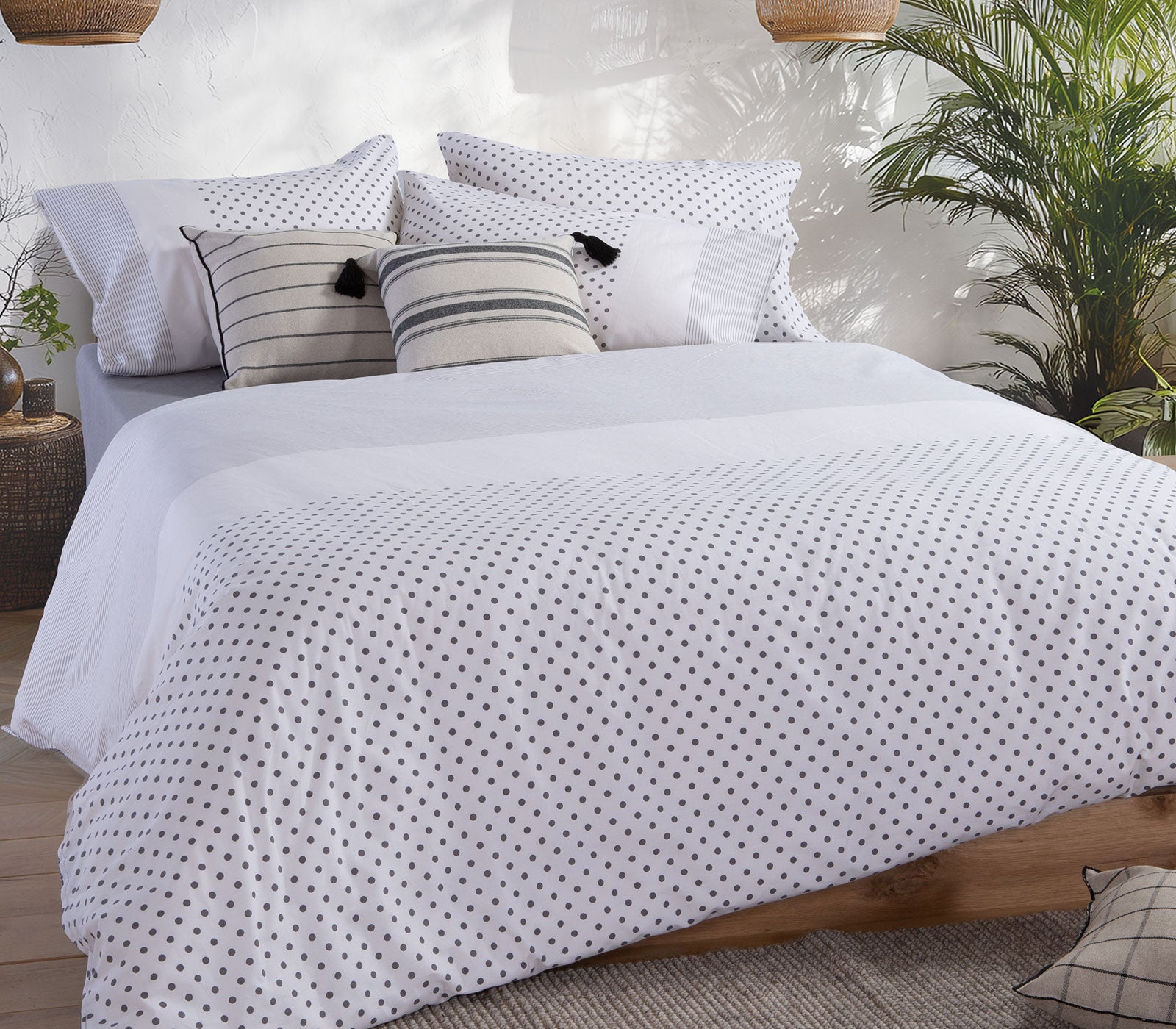 Σετ σεντόνια υπέρδιπλα με λάστιχο Donter σε αποχρώσεις εκρού και πράσινου της εταιρείας Nef-Nef Homeware, κατασκευασμένο από 100% βαμβάκι που προσφέρει απαλή υφή και ευχάριστη αίσθηση στον ύπνο. Το πανωσέντονο διάστασης 240Χ270cm διαθέτει κομψό πουά σχέδιο σε πράσινους τόνους πάνω σε εκρού φόντο, ενώ το κατωσέντονο 160Χ200+35cm είναι μονόχρωμο σε απαλό πράσινο και εφαρμόζει άψογα στο στρώμα χάρη στο περιμετρικό λάστιχο. Το σετ συμπληρώνουν δύο μαξιλαροθήκες 52Χ72cm που ακολουθούν το ίδιο διακριτικό πουά μοτίβο. Ένα διακριτικό και κομψό σχέδιο που ανανεώνει την εικόνα του υπνοδωματίου σας. Ανακαλύψτε το αντίστοιχο κουβερλί για ένα ολοκληρωμένο αποτέλεσμα!