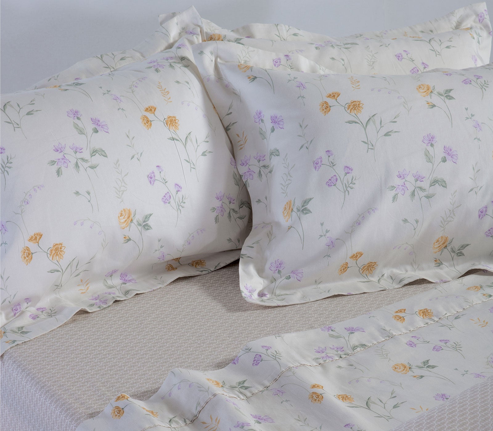 Σετ σεντόνια υπέρδιπλα Rozaria σε εκρού απόχρωση της εταιρείας Nef-Nef Homeware. Είναι κατασκευασμένο από βαμβακοσατέν υψηλής ποιότητας που προσφέρει εξαιρετικά απαλή, λεία υφή και κομψή όψη στο κρεβάτι. Το πανωσέντονο σε διάσταση 240Χ270cm διαθέτει ρομαντικό floral μοτίβο με μικρά λουλούδια σε απαλούς λιλά, κίτρινους και πράσινους τόνους πάνω σε λευκό φόντο, δημιουργώντας μια φωτεινή και αέρινη αισθητική στο υπνοδωμάτιο. Το σετ ολοκληρώνεται με δύο μαξιλαροθήκες Oxford 52Χ72cm που ακολουθούν το ίδιο διακριτικό λουλουδάτο σχέδιο. Συνδυάστε το με κουβερλί της ίδιας σειράς για ένα ολοκληρωμένο αποτέλεσμα!