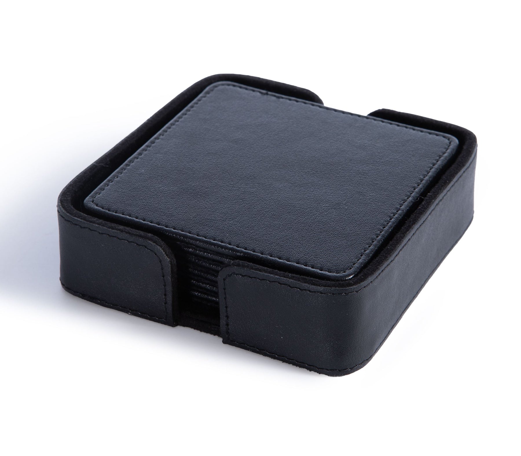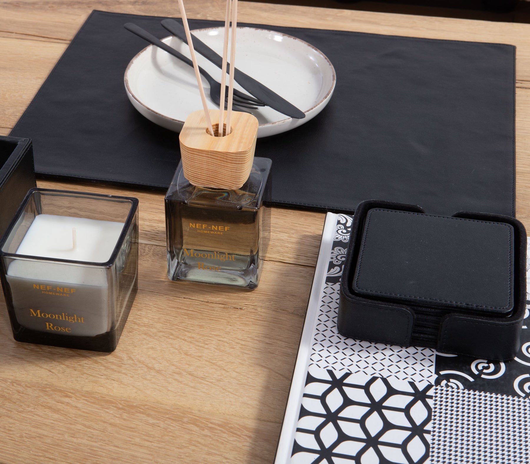 Σουβέρ από τεχνητό δέρμα σετ 6 τεμαχίων (10X10X3cm) της εταιρείας Nef-Nef Homeware σε μαύρη απόχρωση. Κατασκευασμένα από 100% τεχνητό δέρμα, προσθέτουν μια αίσθηση κομψότητας και τάξης στο σαλόνι σας. Κάθε τεμάχιο είναι φτιαγμένο για να προστατεύει τις επιφάνειες από λεκέδες και σημάδια, ενώ η θήκη που τα συνοδεύει τα κρατά πάντα οργανωμένα και εύκολα διαθέσιμα. Ιδανικά για ποτήρια, κούπες ή μικρά σκεύη, συνδυάζουν άνεση στη χρήση με μοντέρνο στυλ, ολοκληρώνοντας τη διακόσμηση του καθιστικού σας.