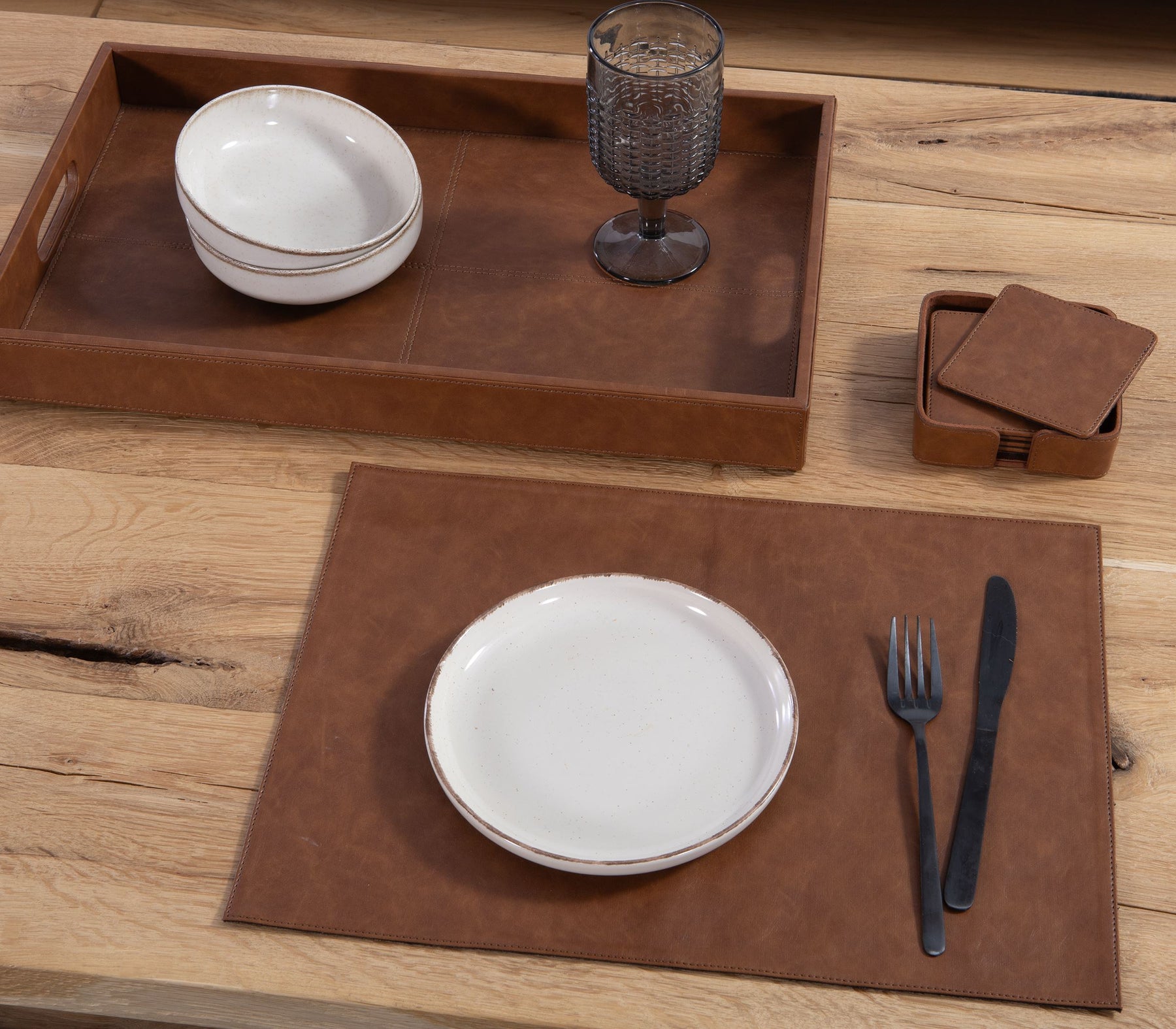 Τα σουπλά από τεχνητό δέρμα σε διάσταση 32x44 cm αποτελούν μια κομψή και πρακτική επιλογή για κάθε τραπέζι. Με σύνθεση 50% τεχνητό δέρμα, προσφέρουν ανθεκτικότητα στην καθημερινή χρήση και εύκολο καθάρισμα, ενώ η υφή τους χαρίζει μια ζεστή και εκλεπτυσμένη πινελιά στη διακόσμηση. Διατίθενται σε δύο αποχρώσεις, ώστε να ταιριάζουν εύκολα σε διαφορετικά στιλ τραπεζαρίας, από μοντέρνα έως πιο κλασικά. Ιδανικά για να αναδείξετε το σερβίτσιο σας και να προστατεύσετε την επιφάνεια του τραπεζιού με στυλ.