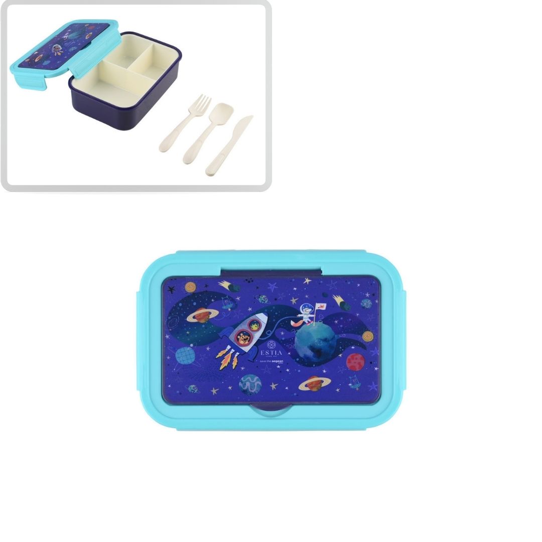 Παιδικό Φαγητοδοχείο σε μπλε χρώμα και σχέδιο διάστημα, πλανήτες και ζωάκια της εταιρία Estia. Είναι κατασκευασμένο από ανθεκτικό πλαστικό υλικό. Έχει χωρητικότητα 900ml και διαθέτει μία αποσπώμενη θήκη με 3 χωρίσματα, ώστε να τοποθετείτε τα φαγητά χωρίς να ανακατεύονται μεταξύ τους. Το τάπερ μπορεί να χρησιμοποιηθεί και χωρίς την αποσπώμενη θήκη. Ιδανικό για το γεύμα του μικρού σας στο σχολείο & τις εκδρομές. Συνδυάστε το με θερμός & ισοθερμική τσάντα φαγητού για ένα ολοκληρωμένο σετ.