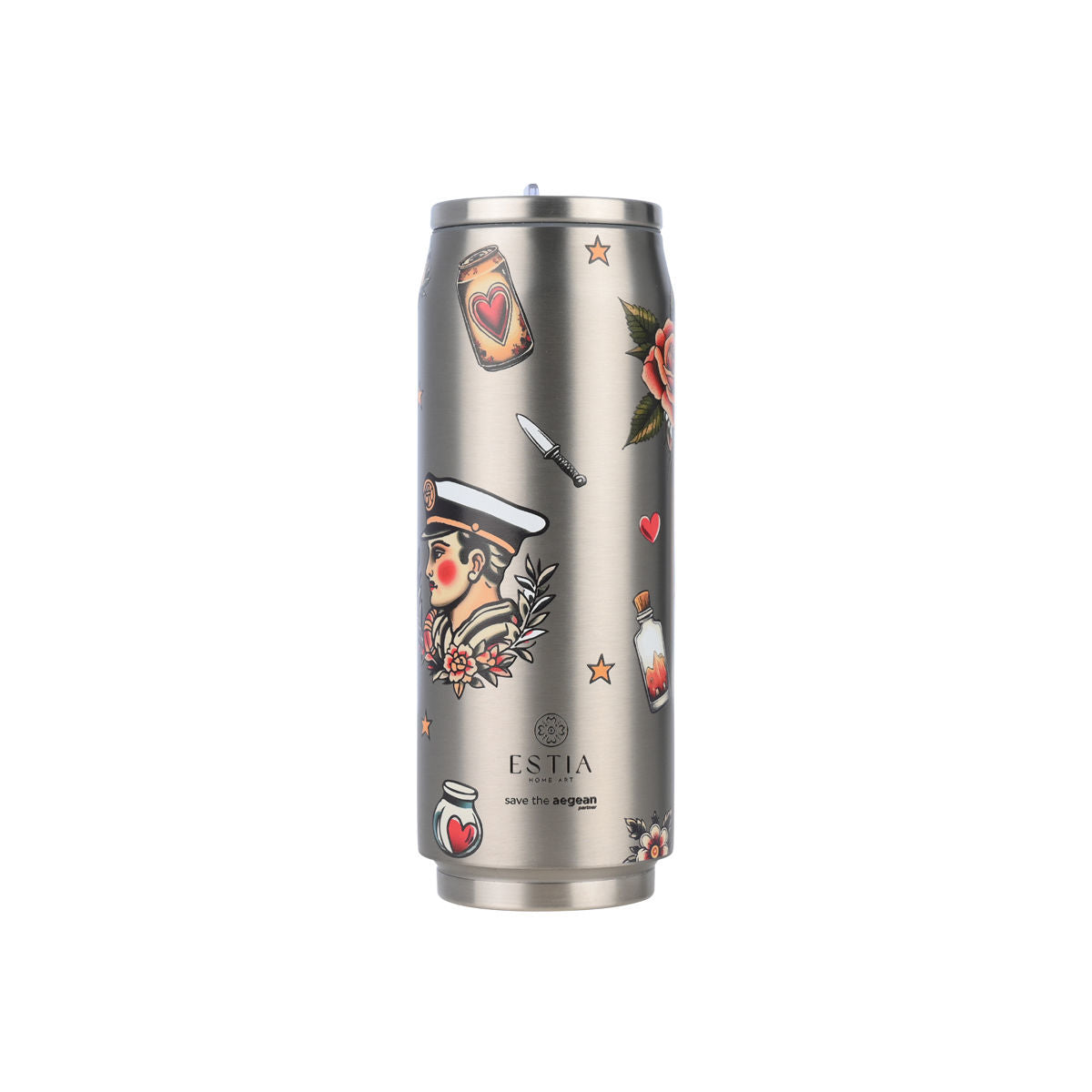 Θερμό ποτήρι Estia Travel Cup 500ml Old School Ink σε μεταλλική απόχρωση με πολύχρωμα σχέδια τατουάζ σε λευκό φόντο.