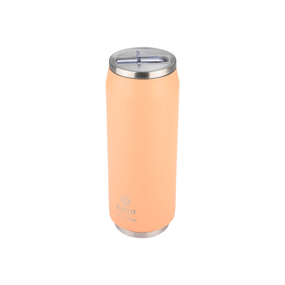 Κυλινδρική συσκευασία του θερμός Estia Home Art Peach Fuzz με επιγραφή “Change the way you drink!” και λογότυπο Save the Aegean, φωτογραφημένη σε καθαρό λευκό φόντο.