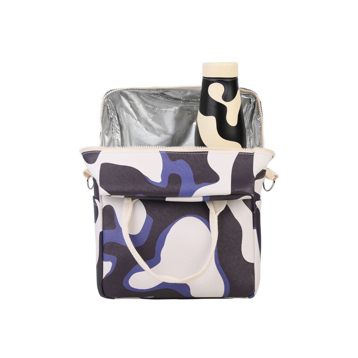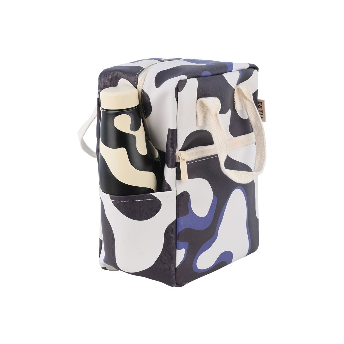 Ισοθερμική τσάντα φαγητού της εταιρείας Estia σε εκρού και μαύρη βάση και μοντέρνο, αφηρημένο σχέδιο σε όλη την επιφάνεια. Εξωτερικά είναι κατασκευασμένη από ανθεκτικό ύφασμα 100% βαμβάκι, ενώ εσωτερικά διαθέτει ισοθερμική επένδυση που διατηρεί το φαγητό ή το ρόφημά σας στην ιδανική θερμοκρασία για περισσότερη ώρα. Διαθέτει δύο θέσεις για μπουκάλια, μία στην κύρια θήκη και μία εξωτερικά, καθώς και πρακτική εξωτερική θήκη με φερμουάρ για κλειδιά, κινητό ή αξεσουάρ. Έχει χωρητικότητα 7Lt. Η ιδανική τσάντα για να έχετε μαζί σας το γεύμα και τα ροφήματά σας στο γραφείο, στο σχολείο ή στο ταξίδι.