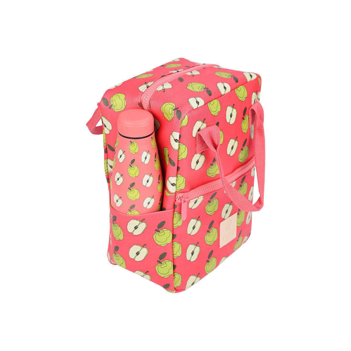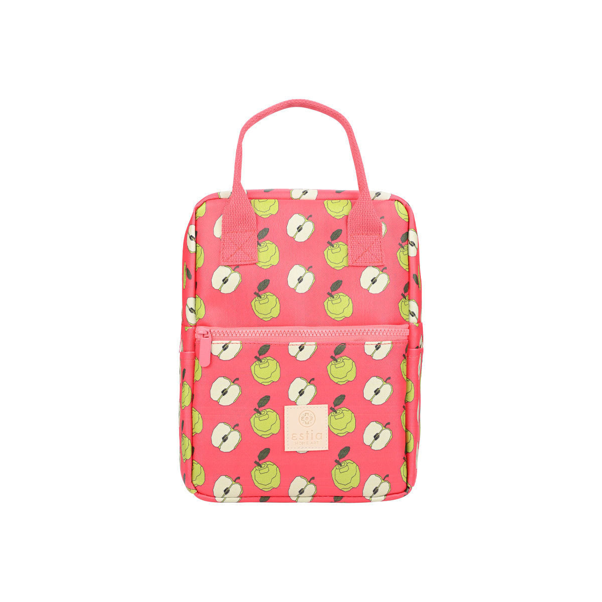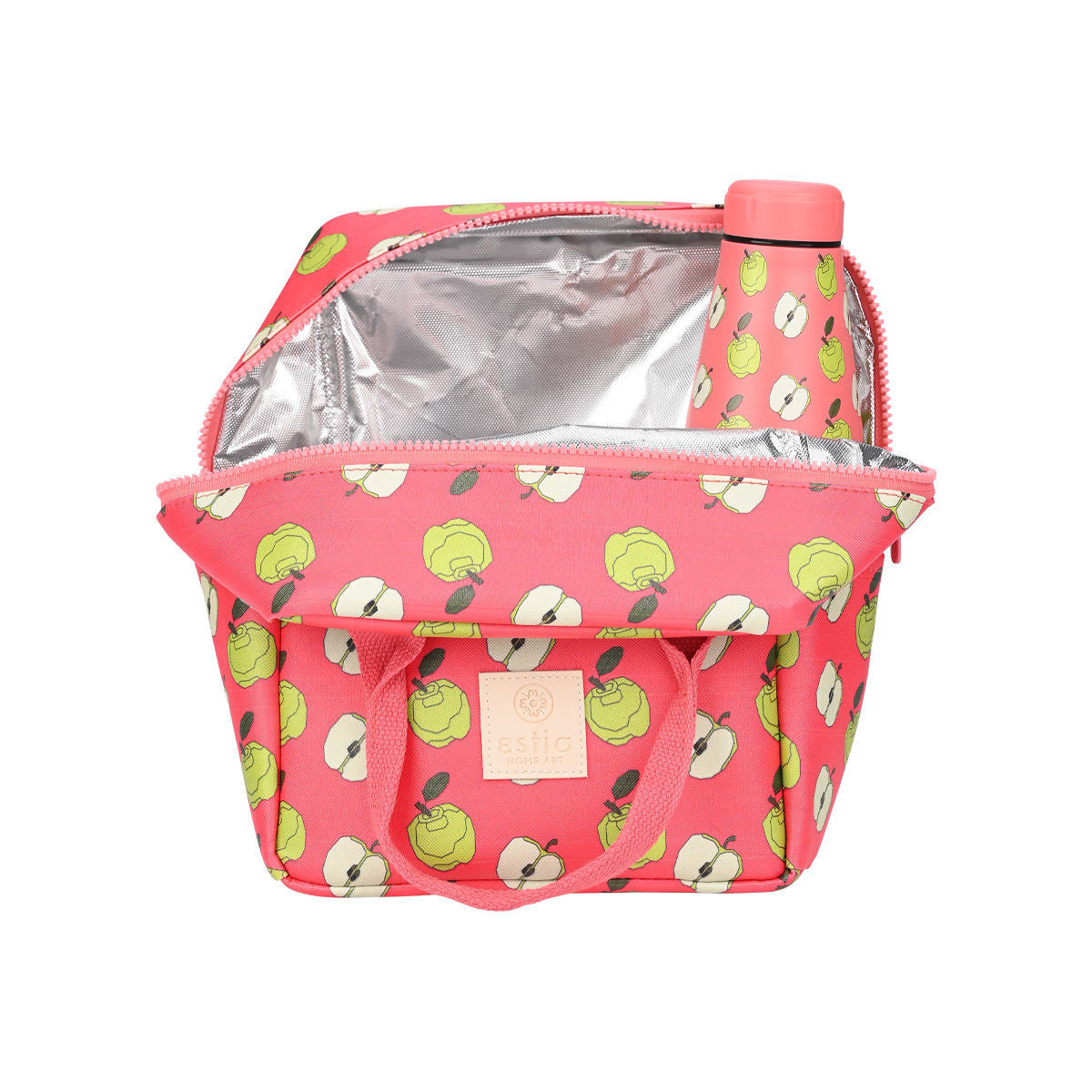 Ισοθερμική τσάντα φαγητού της εταιρείας Estia σε κοραλί χρώμα και σχέδια από μισά και κόκκινα μήλα σε όλη την επιφάνεια. Εξωτερικά είναι κατασκευασμένη από ανθεκτικό ύφασμα 100% βαμβάκι, ενώ εσωτερικά διαθέτει ισοθερμική επένδυση που διατηρεί το φαγητό ή το ρόφημά σας στην ιδανική θερμοκρασία για περισσότερη ώρα. Διαθέτει δύο θέσεις για μπουκάλια, μία στην κύρια θήκη και μία εξωτερικά, καθώς και πρακτική εξωτερική θήκη με φερμουάρ για κλειδιά, κινητό ή αξεσουάρ. Έχει χωρητικότητα 7Lt. Η ιδανική τσάντα για να έχετε μαζί σας το γεύμα και τα ροφήματά σας στο γραφείο, στο σχολείο ή στο ταξίδι.