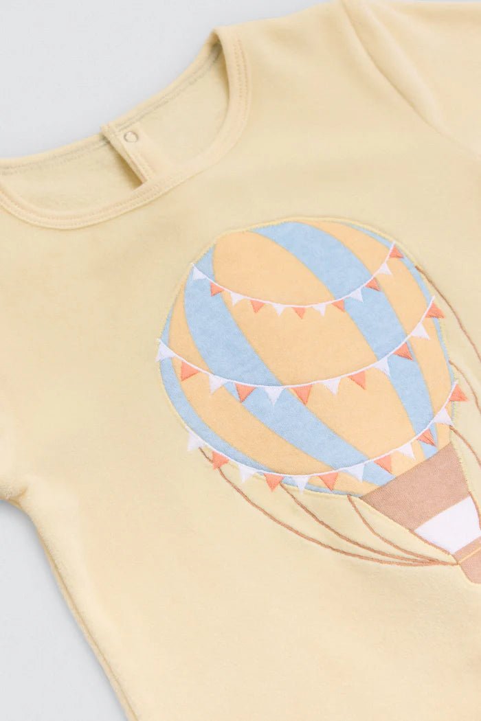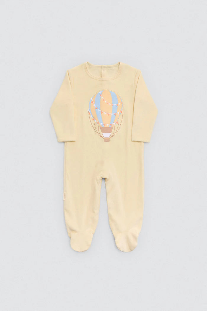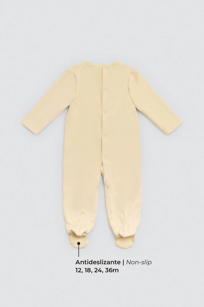 Βρεφικό ολόσωμο κορμάκι της εταιρείας Ysabel Mora, κατασκευασμένο από απαλό και ποιοτικό ύφασμα με ζεστό, φλις στο εσωτερικό για αυξημένη άνεση και θερμική προστασία. Διαθέτει μακρύ μανίκι, κλειστά ποδαράκια με αντιολισθητική επιφάνεια (στα μεγέθη από 12-36) και πρακτικό κλείσιμο με κουμπάκια για εύκολη αλλαγή. Το απαλό κίτρινο χρώμα και το γλυκό σχέδιο με αερόστατο δημιουργούν μια τρυφερή, παιχνιδιάρικη εμφάνιση, ιδανική για τις πρώτες κινήσεις και τα πρώτα βήματα του μωρού. Συνιστάται πλύσιμο σε χαμηλή θερμοκρασία και από την ανάποδη πλευρά, ενώ καλό είναι να αποφεύγεται το στεγνωτήριο για να διατηρείται η απαλότητα του υφάσματος.