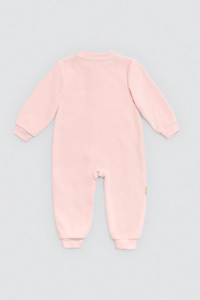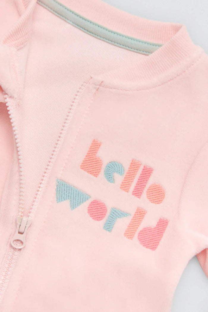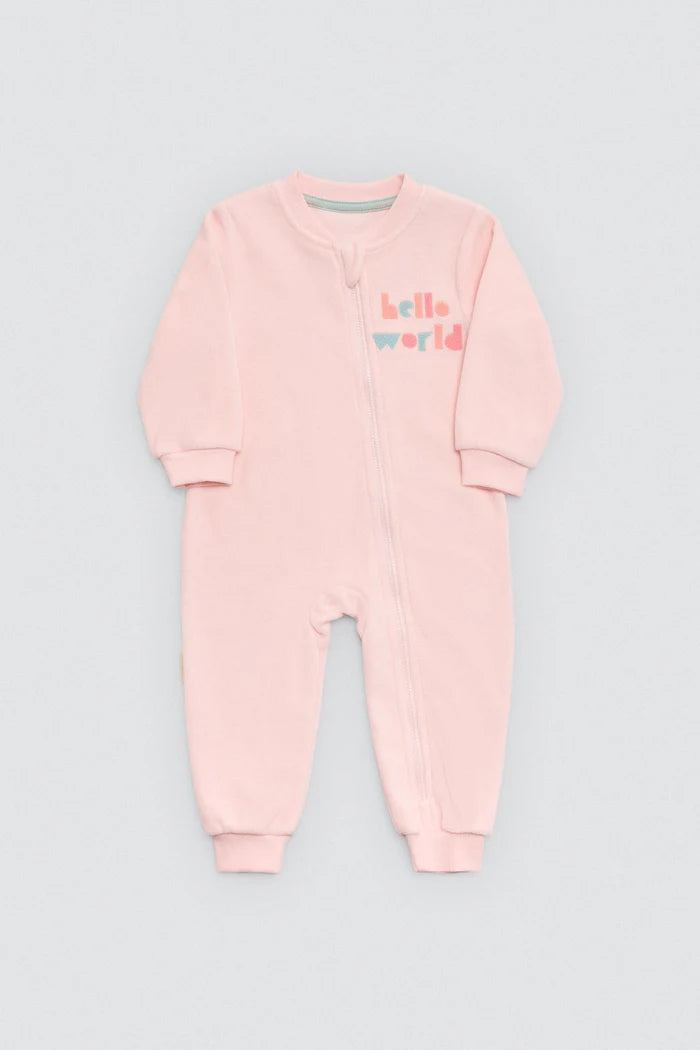 Βρεφικό unisex ολόσωμο κορμάκι της εταιρείας Ysabel Mora, από απαλό και ποιοτικό ύφασμα με ζεστό φλις στο εσωτερικό, ιδανικό για άνεση και θαλπωρή τους πρώτους μήνες. Διαθέτει μακρύ μανίκι, κλειστά ποδαράκια και πρακτικό μπροστινό φερμουάρ για εύκολο ντύσιμο. Το απαλό ροζ χρώμα και το παιχνιδιάρικο κέντημα hello world χαρίζουν μια γλυκιά, τρυφερή εμφάνιση. Συνιστάται πλύσιμο σε χαμηλή θερμοκρασία και από την ανάποδη πλευρά, ενώ καλό είναι να αποφεύγεται το στεγνωτήριο για να διατηρείται η απαλότητα του υφάσματος.