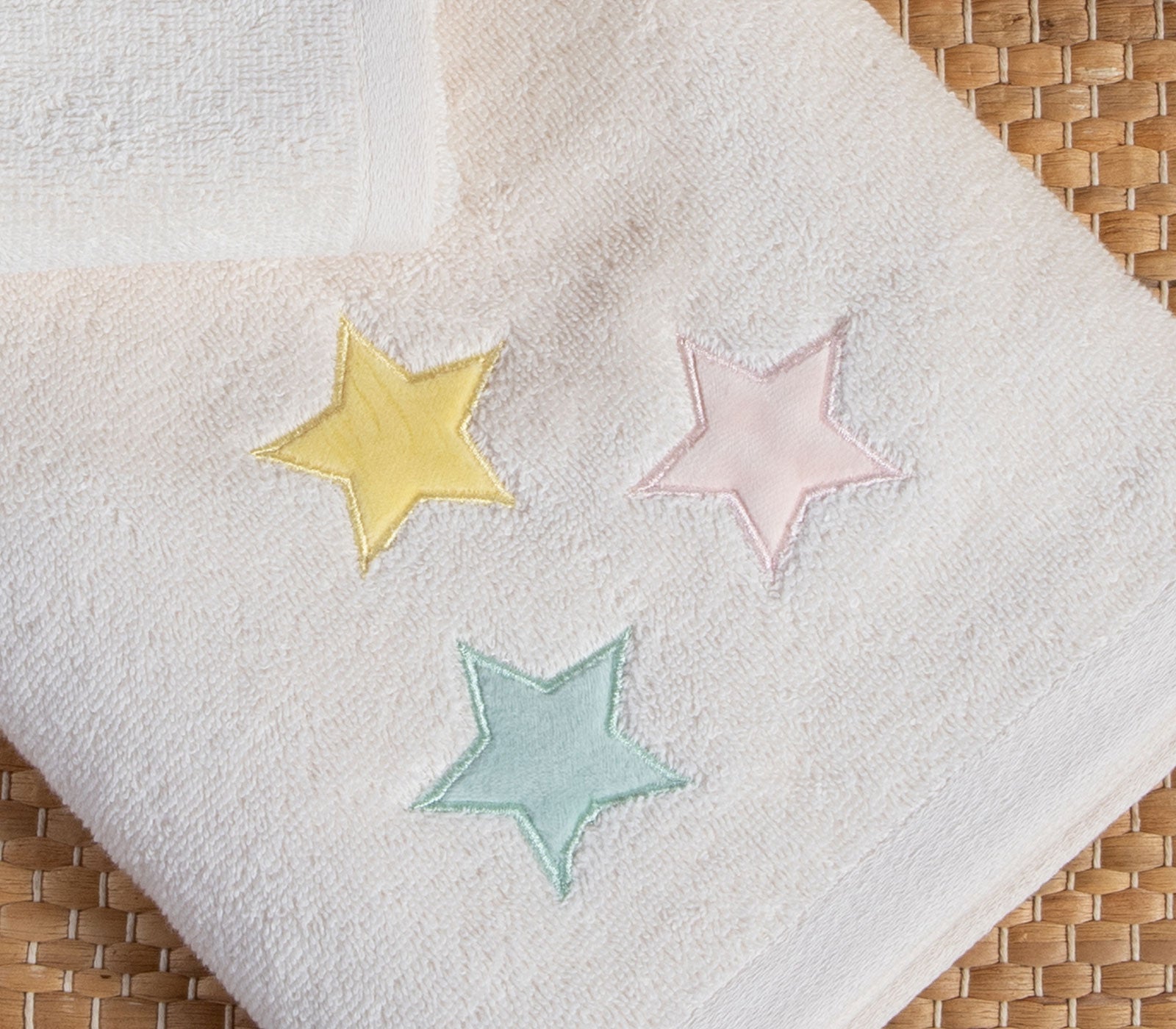 Βρεφικές πετσέτες σετ 2 τεμαχίων της εταιρείας Nef-Nef Homeware σε απαλή εκρού απόχρωση από τη σειρά Happy. Είναι κατασκευασμένες από 100% βαμβάκι που προσφέρει απαλή υφή, υψηλή απορροφητικότητα και ευχάριστη αίσθηση στο ευαίσθητο βρεφικό δέρμα. Το χαριτωμένο σχέδιο με τα κεντημένα αστέρια σε παστέλ αποχρώσεις χαρίζει παιχνιδιάρικη και τρυφερή αισθητική που ταιριάζει όμορφα σε κάθε βρεφικό μπάνιο. Ένα όμορφο σετ που αγκαλιάζει απαλά το μωρό σας μετά το μπάνιο, προσφέροντας μία γλυκιά αίσθηση φροντίδας.