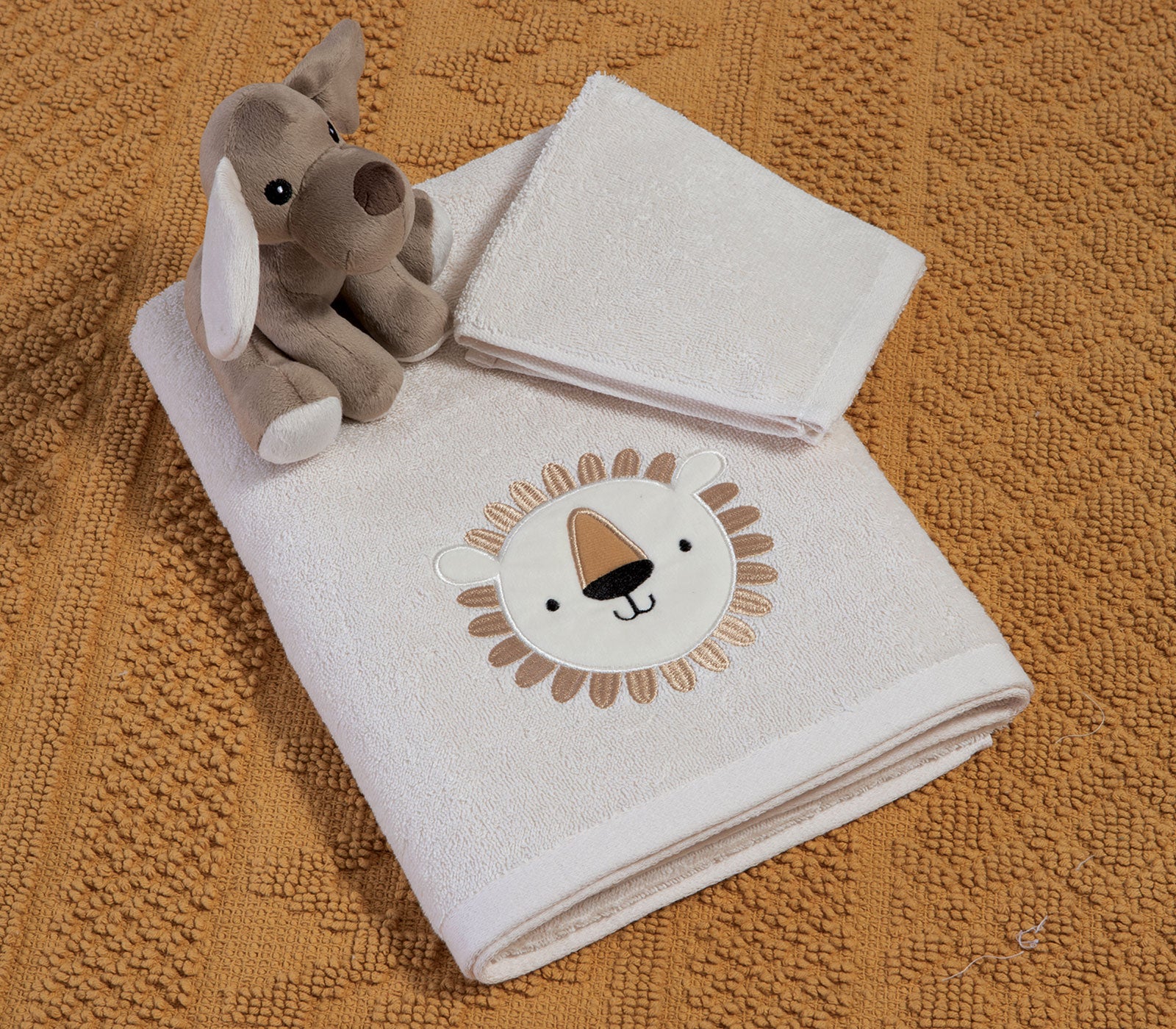 Σετ εκρού βρεφικών πετσετών με κεντημένο λιονταράκι, τοποθετημένες πάνω σε υφασμάτινο φόντο με λούτρινο παιχνίδι δίπλα.