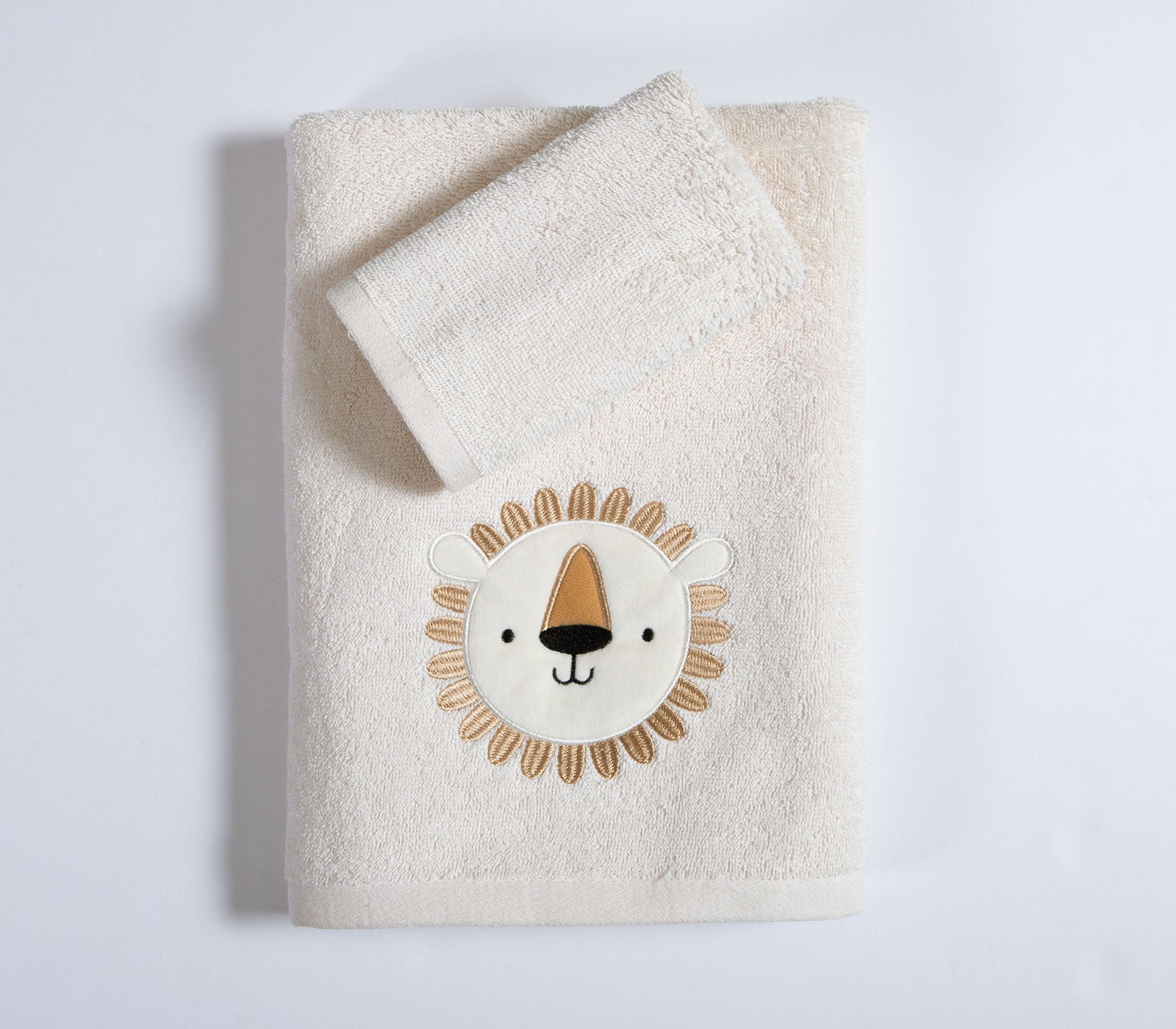 Εκρού βρεφική πετσέτα με κεντημένο σχέδιο λιονταριού και μικρή πετσέτα τοποθετημένη επάνω σε καθαρό λευκό φόντο στούντιο.