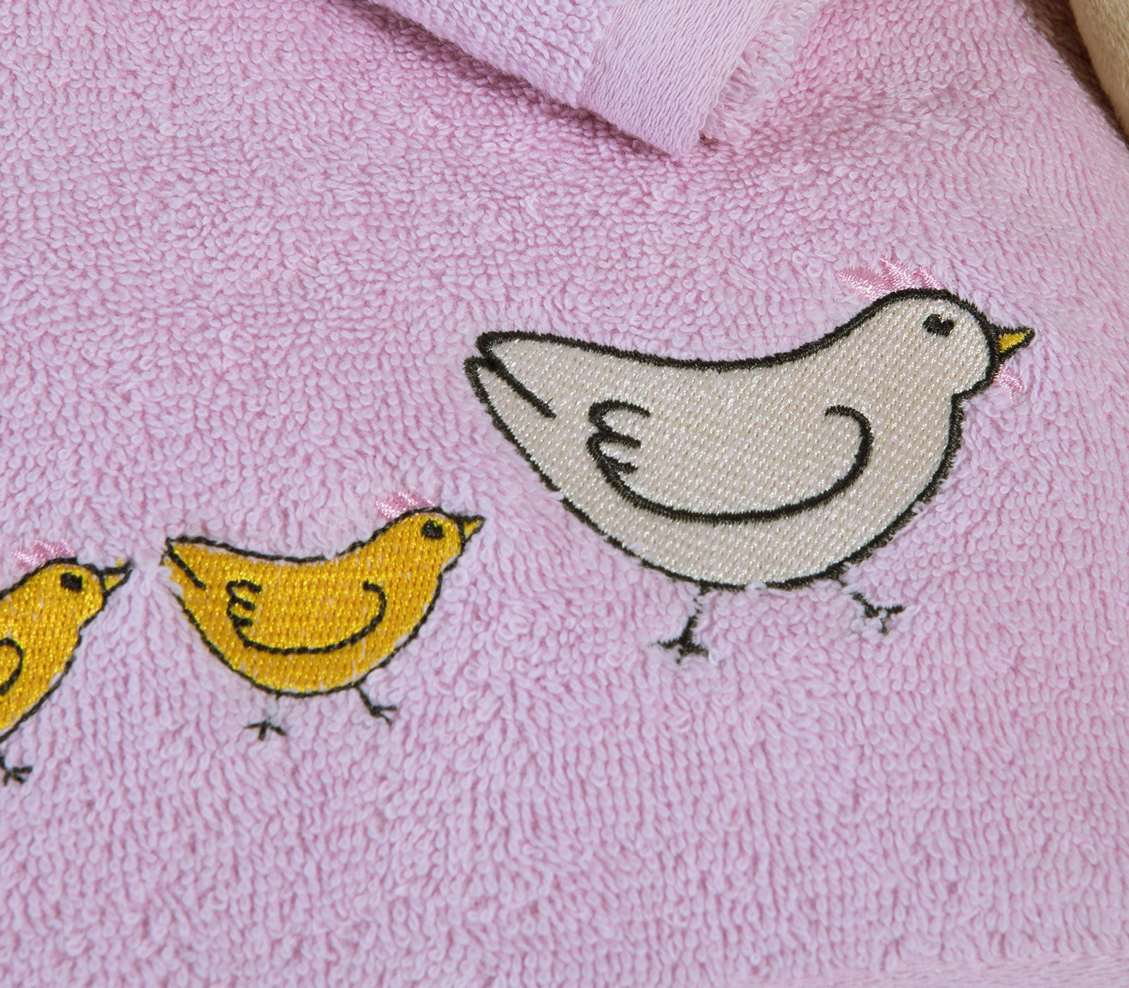 Κοντινή λήψη βρεφικής λιλά πετσέτας με κέντημα τρία μικρά πουλάκια σε απαλή βαμβακερή υφή.