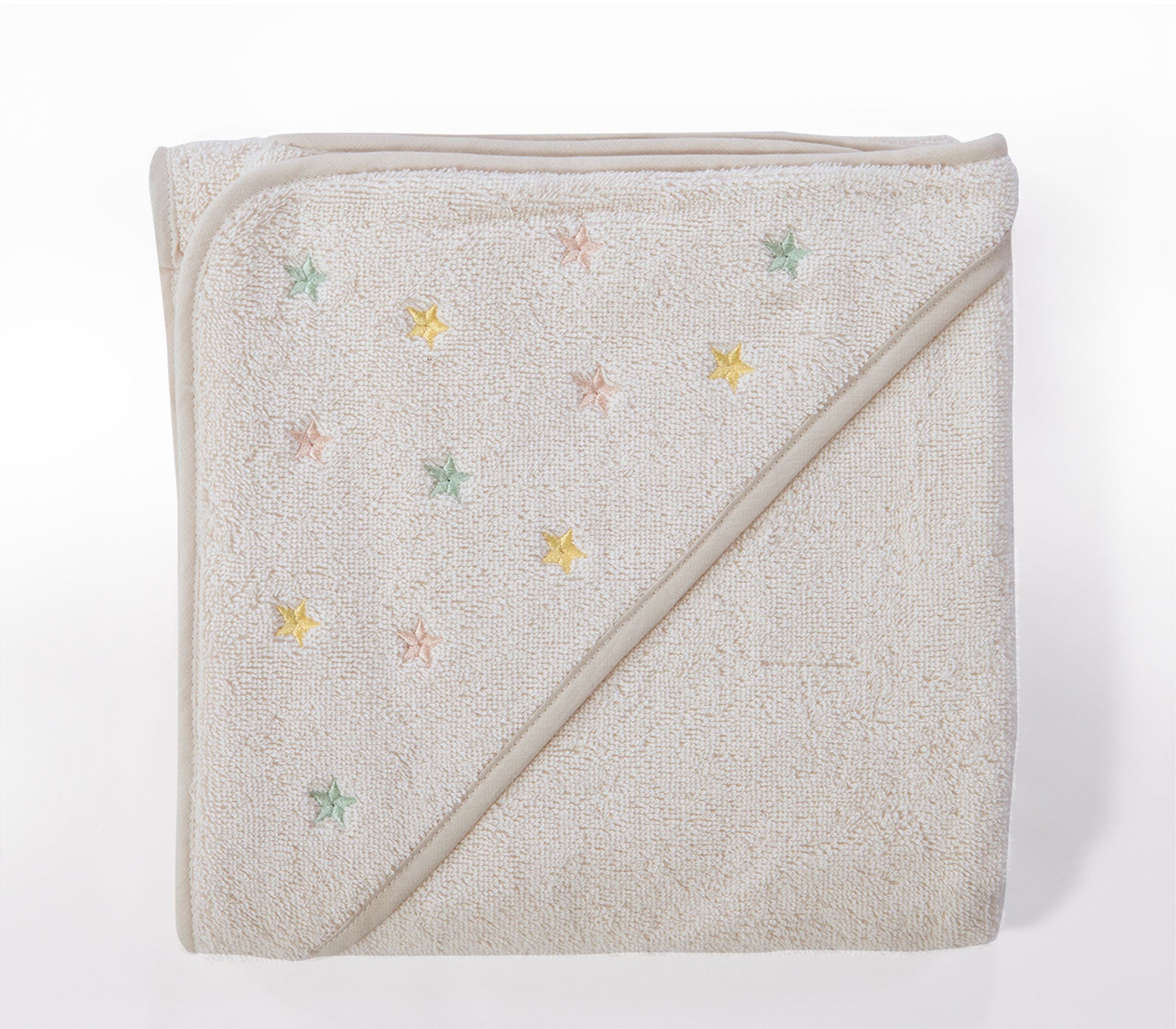 Βρεφική κάπα μπάνιου της εταιρείας Nef-Nef Homeware σε απαλή εκρού απόχρωση από τη σειρά Happy. Είναι κατασκευασμένη από 100% βαμβάκι που προσφέρει απαλή υφή, υψηλή απορροφητικότητα και ευχάριστη αίσθηση στο ευαίσθητο βρεφικό δέρμα. Το χαριτωμένο σχέδιο με τα μικρά κεντημένα αστέρια σε παστέλ αποχρώσεις χαρίζει παιχνιδιάρικη και τρυφερή αισθητική που ταιριάζει όμορφα στο βρεφικό μπάνιο. Μια απαλή και ζεστή αγκαλιά μετά το μπάνιο που προσφέρει στο μωρό σας άνεση και μια γλυκιά αίσθηση φροντίδας.