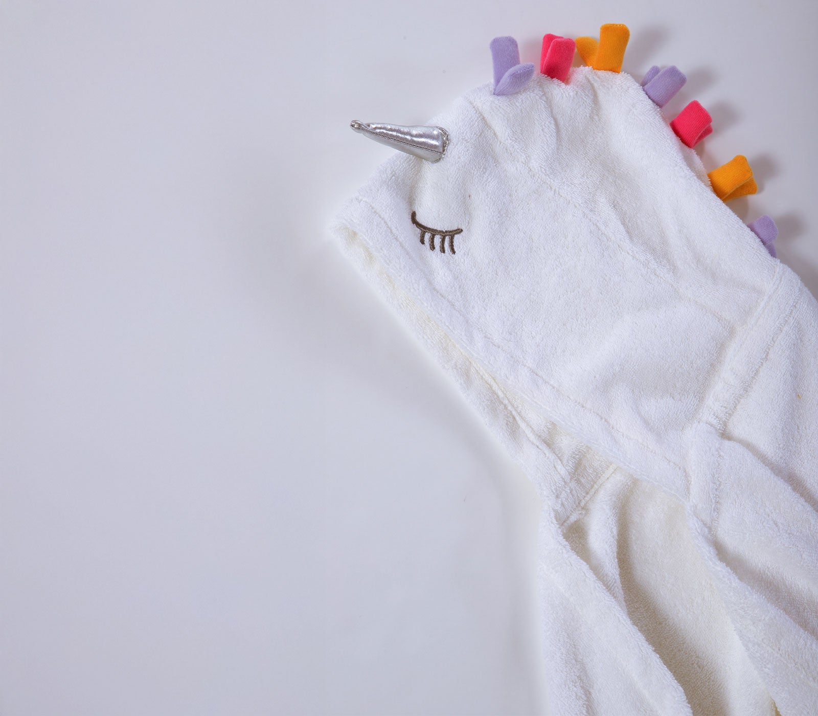 Βρεφική κάπα μπάνιου της εταιρείας Nef-Nef Homeware σε απαλή λευκή απόχρωση από τη σειρά Unicorn. Είναι κατασκευασμένη από 100% βαμβάκι που προσφέρει απαλή υφή, υψηλή απορροφητικότητα και ευχάριστη αίσθηση στο ευαίσθητο βρεφικό δέρμα μετά το μπάνιο. Η κουκούλα διακοσμείται με χαριτωμένο σχέδιο μονόκερου με μικρές πολύχρωμες λεπτομέρειες που χαρίζουν παιχνιδιάρικη και ονειρική αισθητική. Μια τρυφερή επιλογή που αγκαλιάζει απαλά το μωρό σας και μετατρέπει τη στιγμή μετά το μπάνιο σε μια γλυκιά εμπειρία φροντίδας.