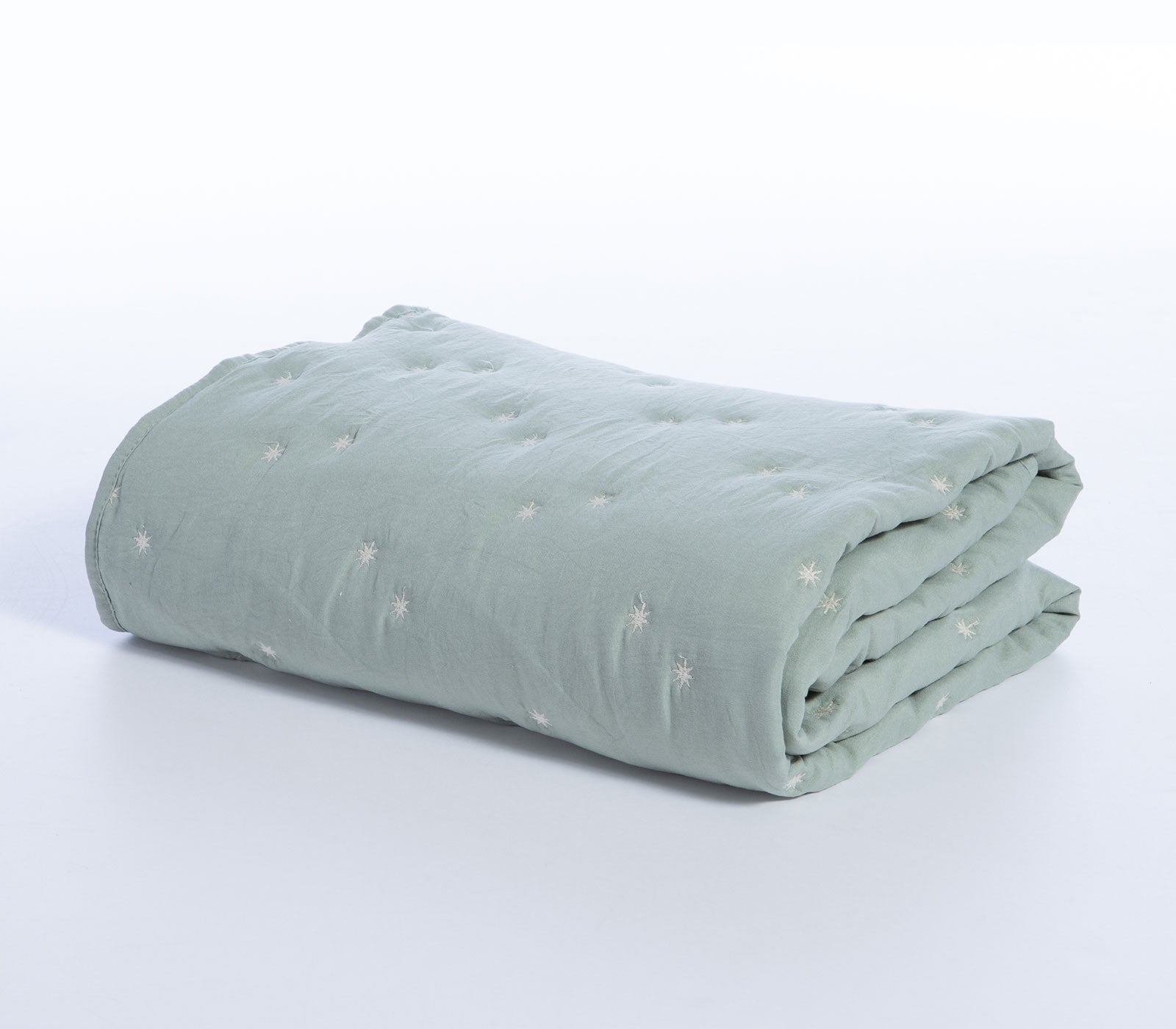 Διπλωμένο βρεφικό κουβερλί σε μέντα απόχρωση με μικρά λευκά κεντημένα αστέρια σε λευκό φόντο.