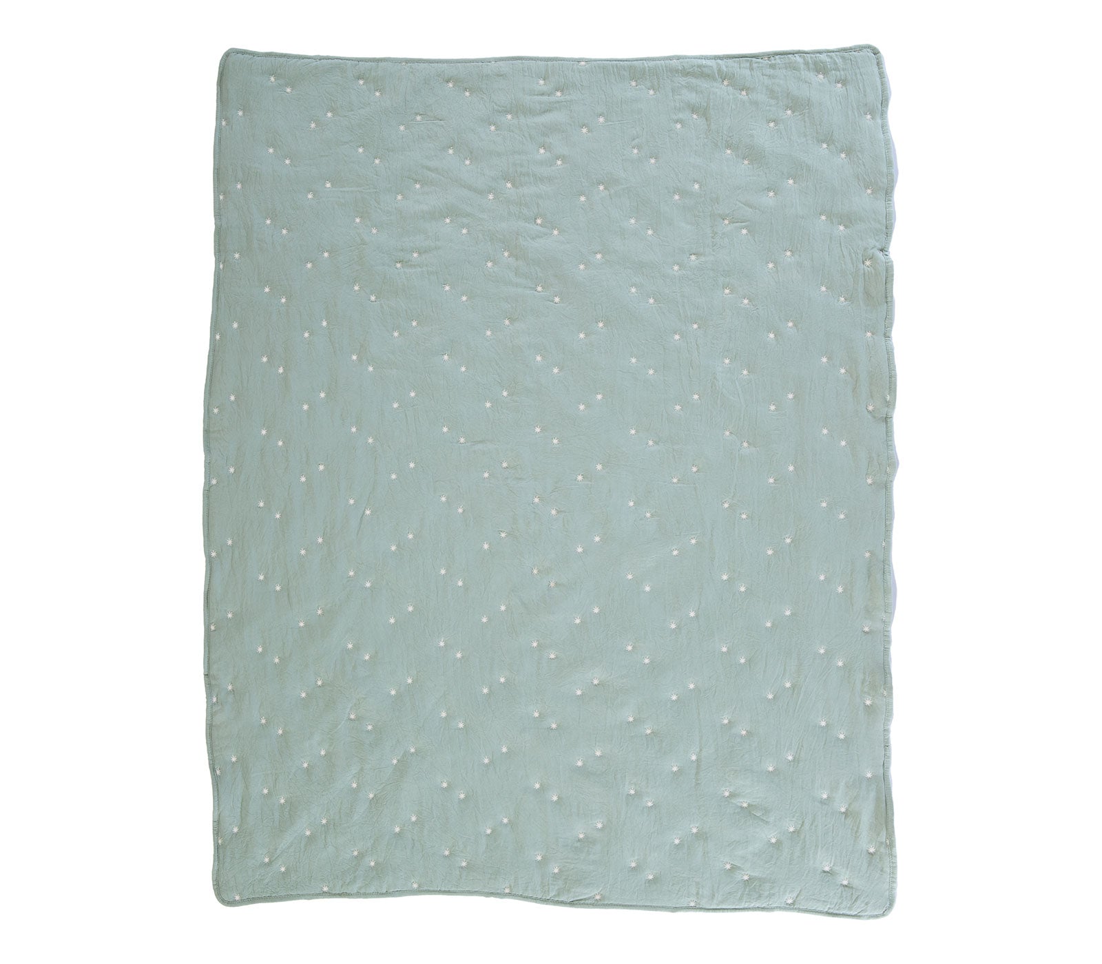 Διπλωμένο βρεφικό κουβερλί σε μέντα απόχρωση με μικρά λευκά κεντημένα αστέρια σε λευκό φόντο.