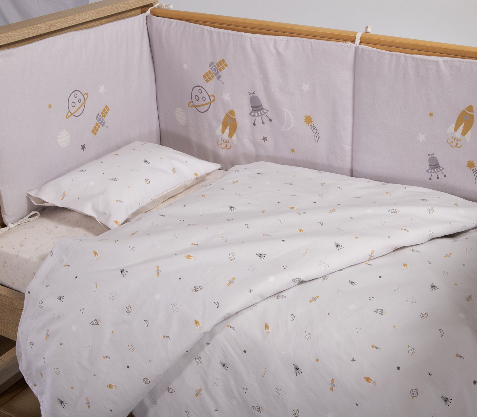 Σετ βρεφικών σεντονιών για κούνια σε λευκό χρώμα με γκρι και κίτρινα σχέδια διαστήματος, όπως πύραυλοι, πλανήτες, δορυφόροι και αστέρια. Το σετ περιλαμβάνει παπλωματοθήκη, μαξιλαροθήκη και πάντα κούνιας σε γκρι-λιλά φόντο με το ίδιο μοτίβο
