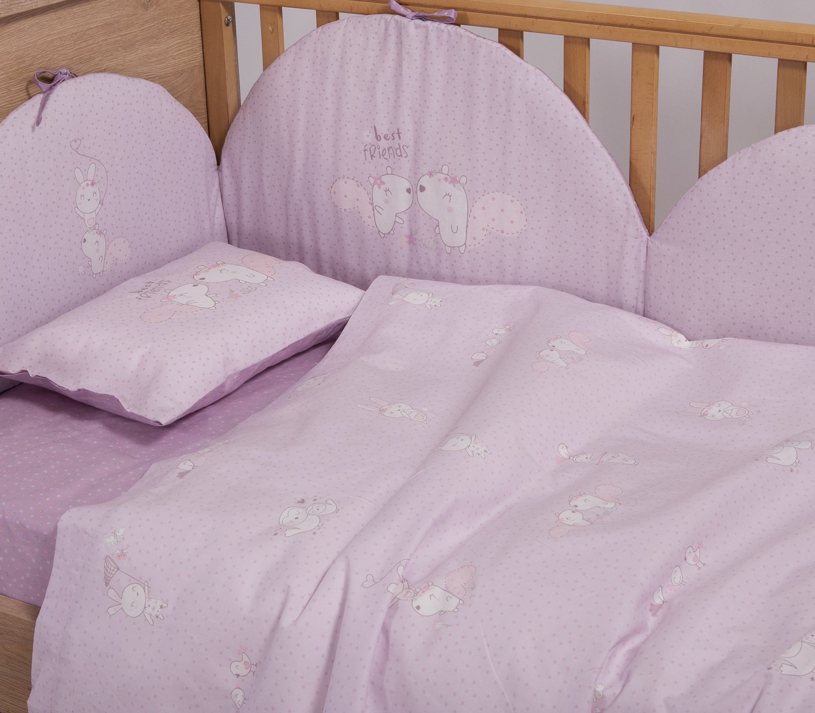 Βρεφική πάντα κούνιας διπλής όψης της εταιρίας Nef-Nef Homeware. Έχει διάσταση 60cm στα πλαϊνά της κούνιας, 67cm στο κεφαλάρι και 40cm ύψος. Είναι κατασκευασμένη από 100% βαμβακερό ύφασμα, ενώ το γέμισμά της είναι 100% πολυεστερικό. Η μία πλευρά έχει λιλά βάση με πουά μοτίβο σε όλη την επιφάνεια και σχέδιο στο κέντρο με ζωάκια και λεκτικό "Best Friends". Η δεύτερη όψη είναι μωβ και διαθέτει πουά print. Είναι η ιδανική λύση για να προστατέψετε το μωρό σας από ατυχήματα στην κούνια. Ολοκληρώστε το look του βρεφικού δωματίου συνδυάζοντας ύψηλής ποιότητας σεντόνια, πάπλωμα και κουβέρτα.