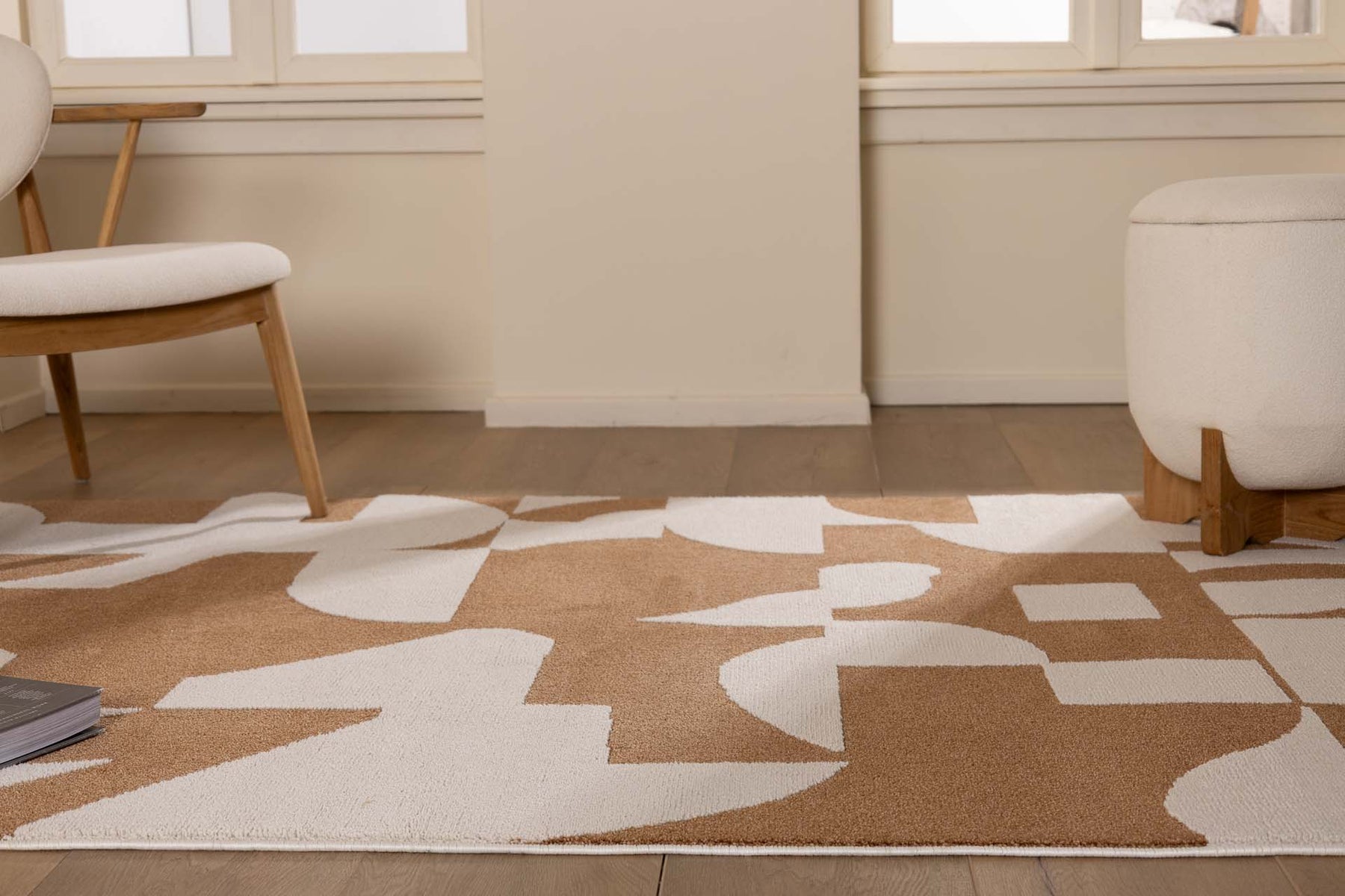 Μοντέρνο χαλί σε καφέ και μπεζ αποχρώσεις με αφηρημένο σχέδιο, σε σαλόνι με ξύλινο πάτωμα, μπεζ πολυθρόνα και φυσικό φως.