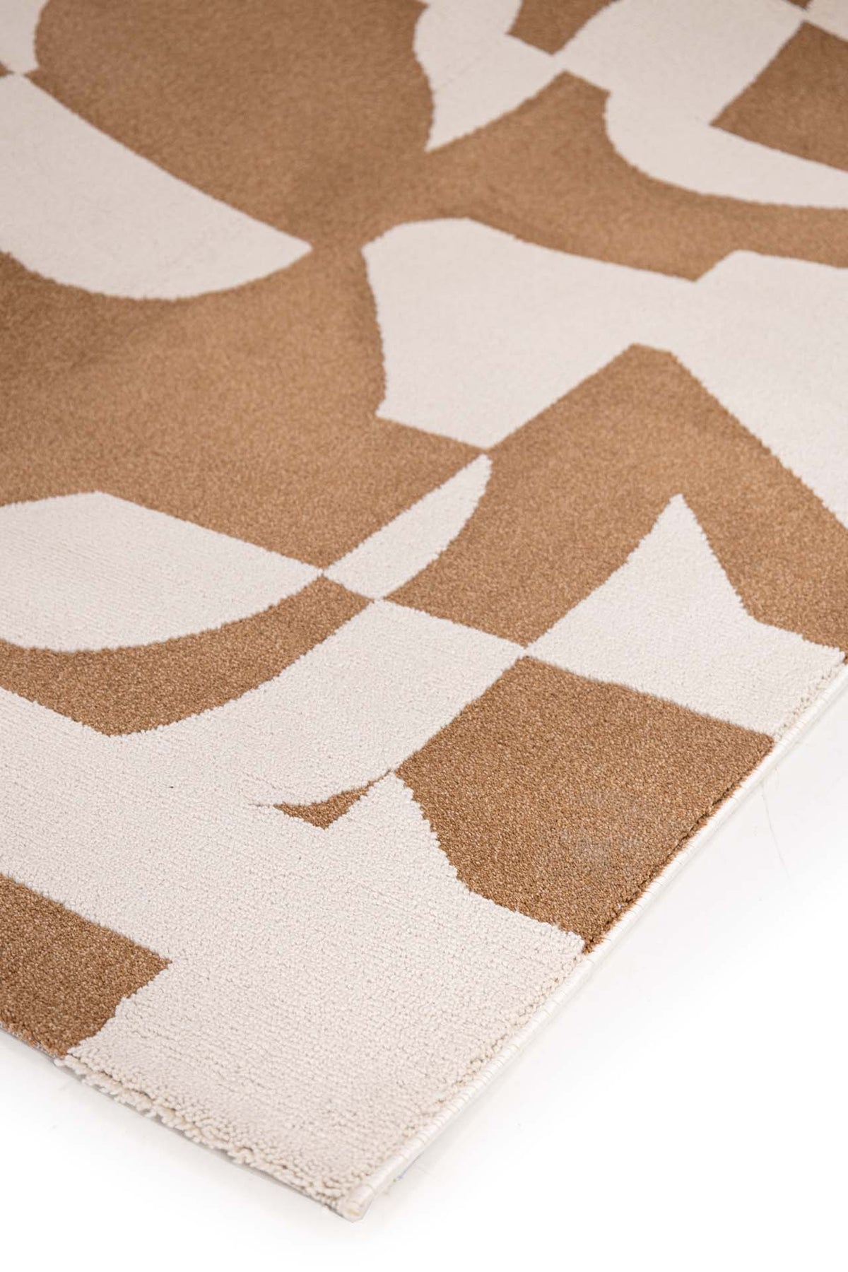 Κοντινή λήψη μοντέρνου χαλιού με καφέ και μπεζ γεωμετρικά μοτίβα, που αναδεικνύει την υφή και το σχέδιο.