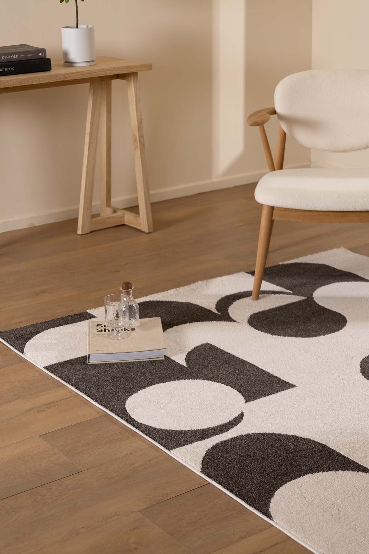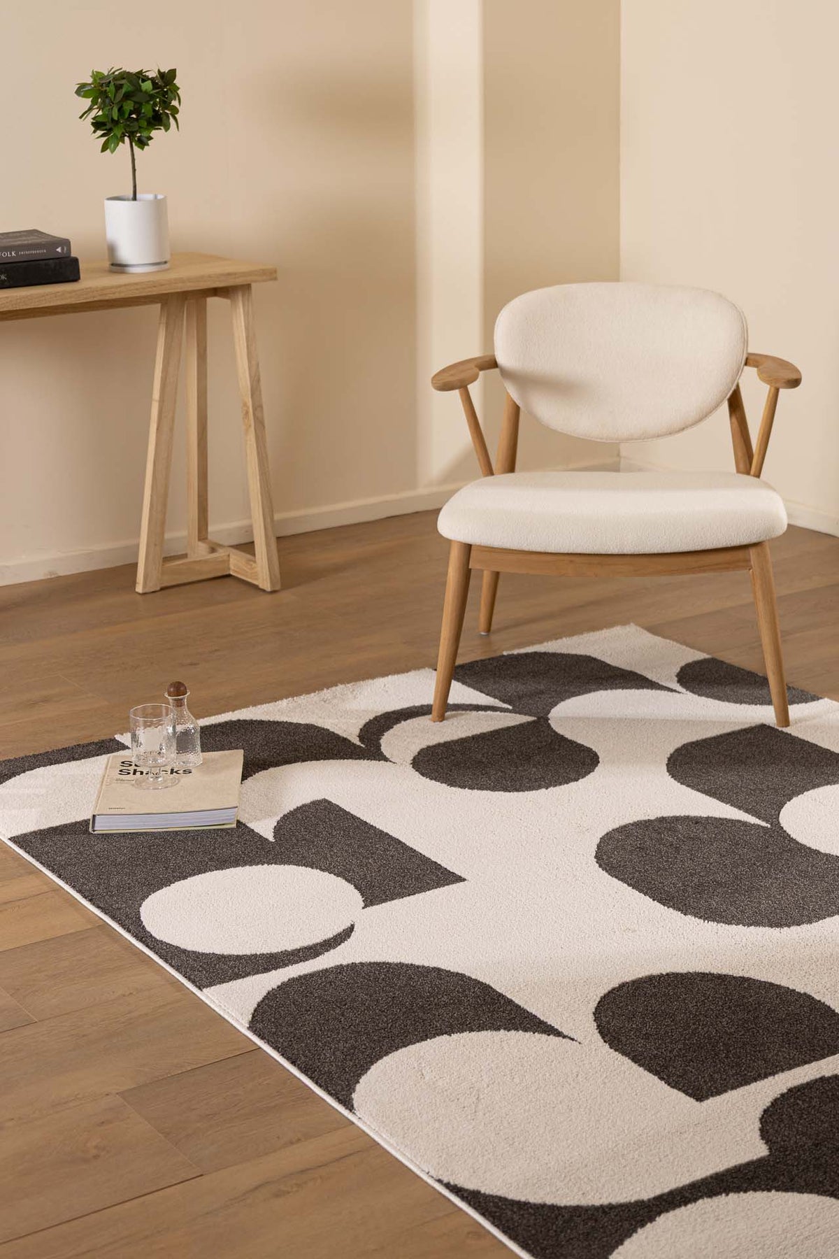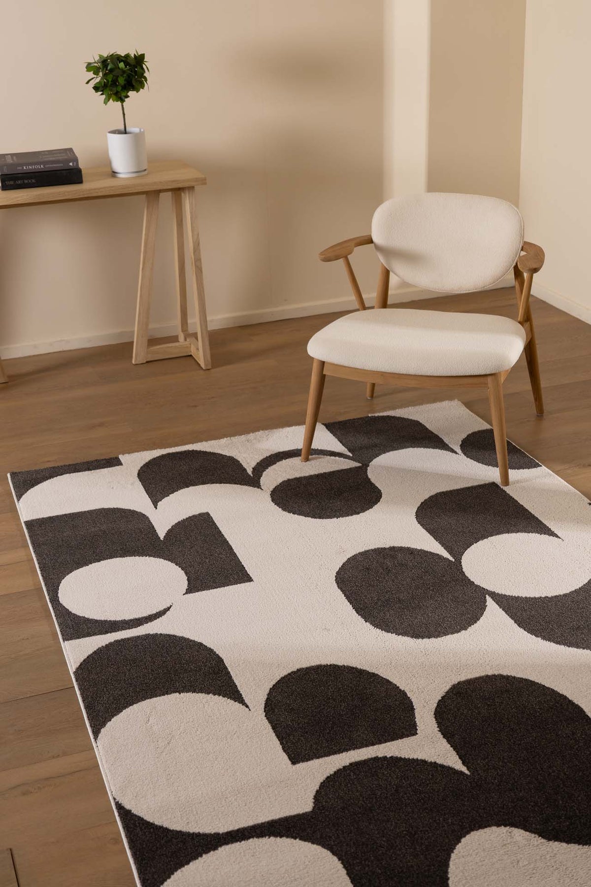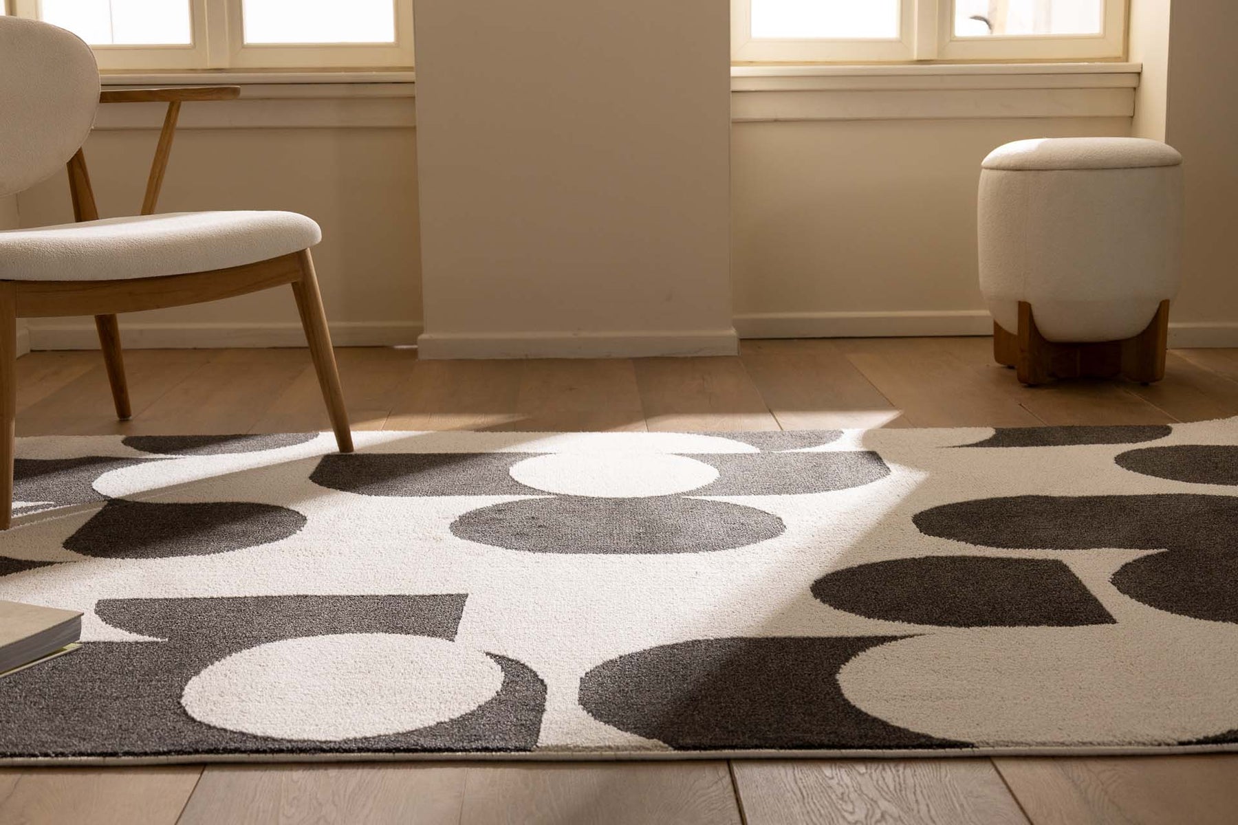 Μοντέρνο γκρι χαλί με μαύρα και λευκά σχήματα σε minimal χώρο με ξύλινο πάτωμα και πολυθρόνα.