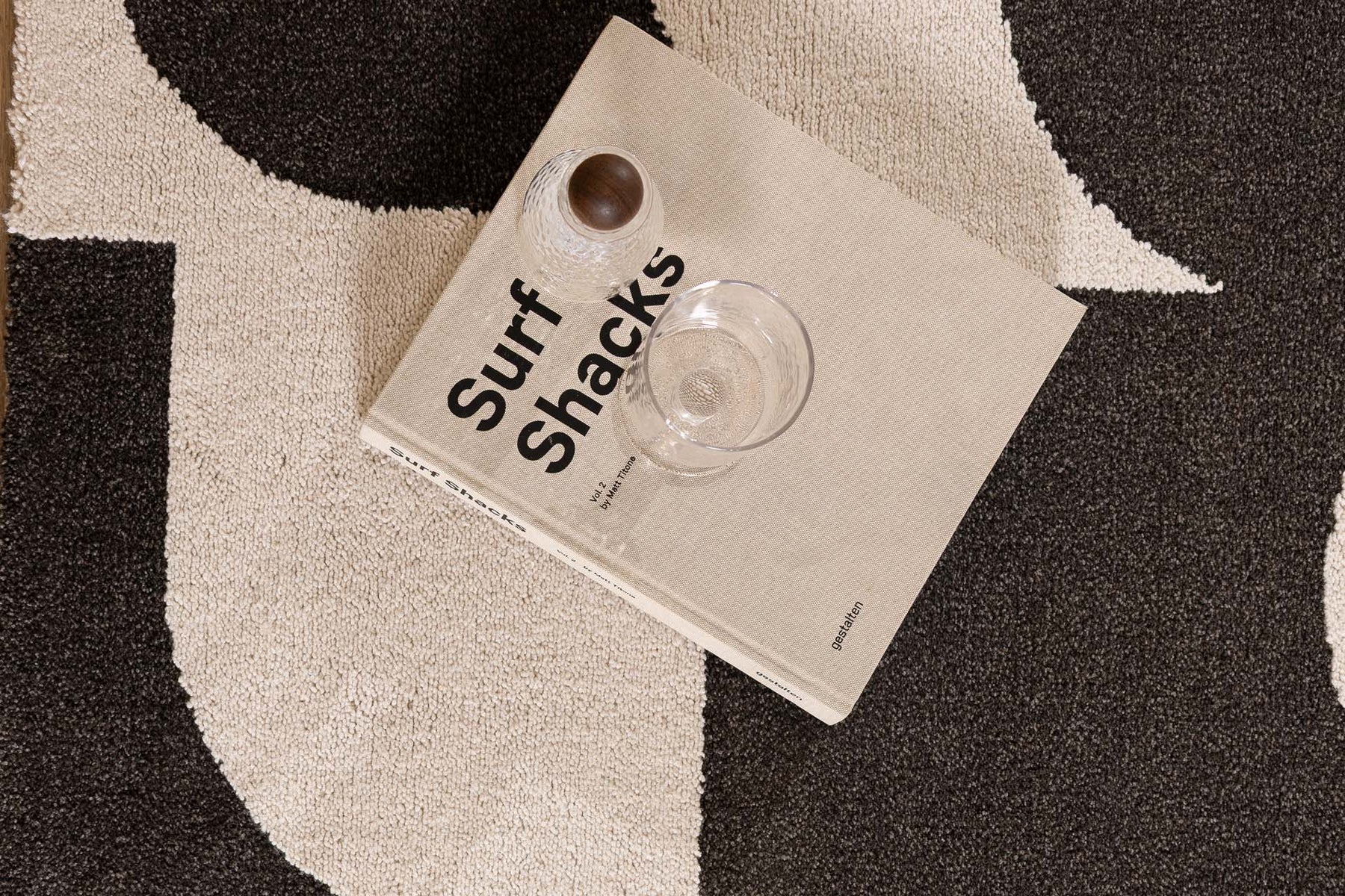 Γκρι χαλί με γεωμετρικά μαύρα και λευκά σχήματα σε κοντινή λήψη, διακοσμημένο με βιβλίο και γυάλινα ποτήρια.