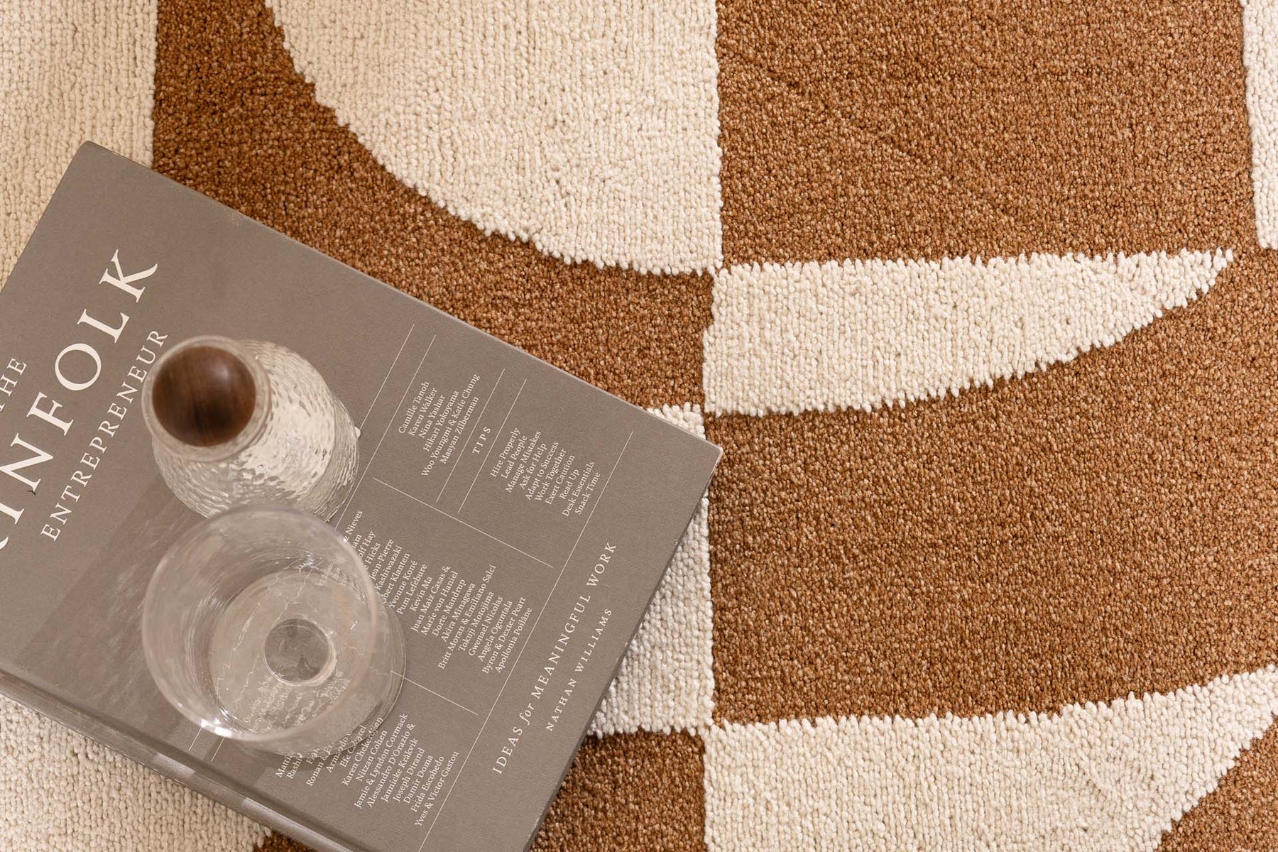 Κοντινή λήψη από γωνία χαλιού με καφέ και μπεζ γεωμετρικά σχέδια, πλάι σε διακοσμητικό βιβλίο και ποτήρι.