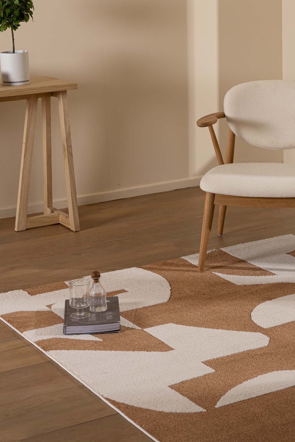 Μοντέρνο χαλί σε καφέ και μπεζ αποχρώσεις με αφηρημένο σχέδιο, σε σαλόνι με ξύλινο πάτωμα, μπεζ πολυθρόνα και φυσικό φως.