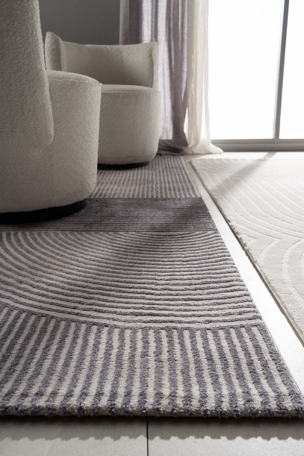 Δίχρωμο χαλί Organic Royal Carpet σε γκρι και εκρού, με κυκλικά και γραμμικά σχέδια, λεπτομέρεια από κοντινή λήψη στο πάτωμα.