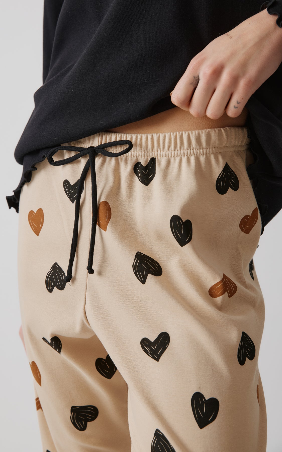 Γυναικεία πιτζάμα της εταιρείας Minerva κατασκευασμένη από 100% βαμβάκι, με μακρυμάνικη μπλούζα σε μαύρη απόχρωση που διαθέτει στρογγυλή λαιμόκοψη, παιχνιδιάρικη στάμπα “Caffeine Queen” και κυματιστό φινίρισμα στο τελείωμα για διακριτική θηλυκή πινελιά. Το σετ ολοκληρώνεται με παντελόνι σε σχέδιο με καρδιές σε μαύρο και καφέ χρώμα, με μαλακό τελείωμα στους αστραγάλους για cozy εφαρμογή. Η σύνθεση και η άνετη γραμμή εξασφαλίζουν φυσική απαλότητα και ελευθερία κινήσεων.