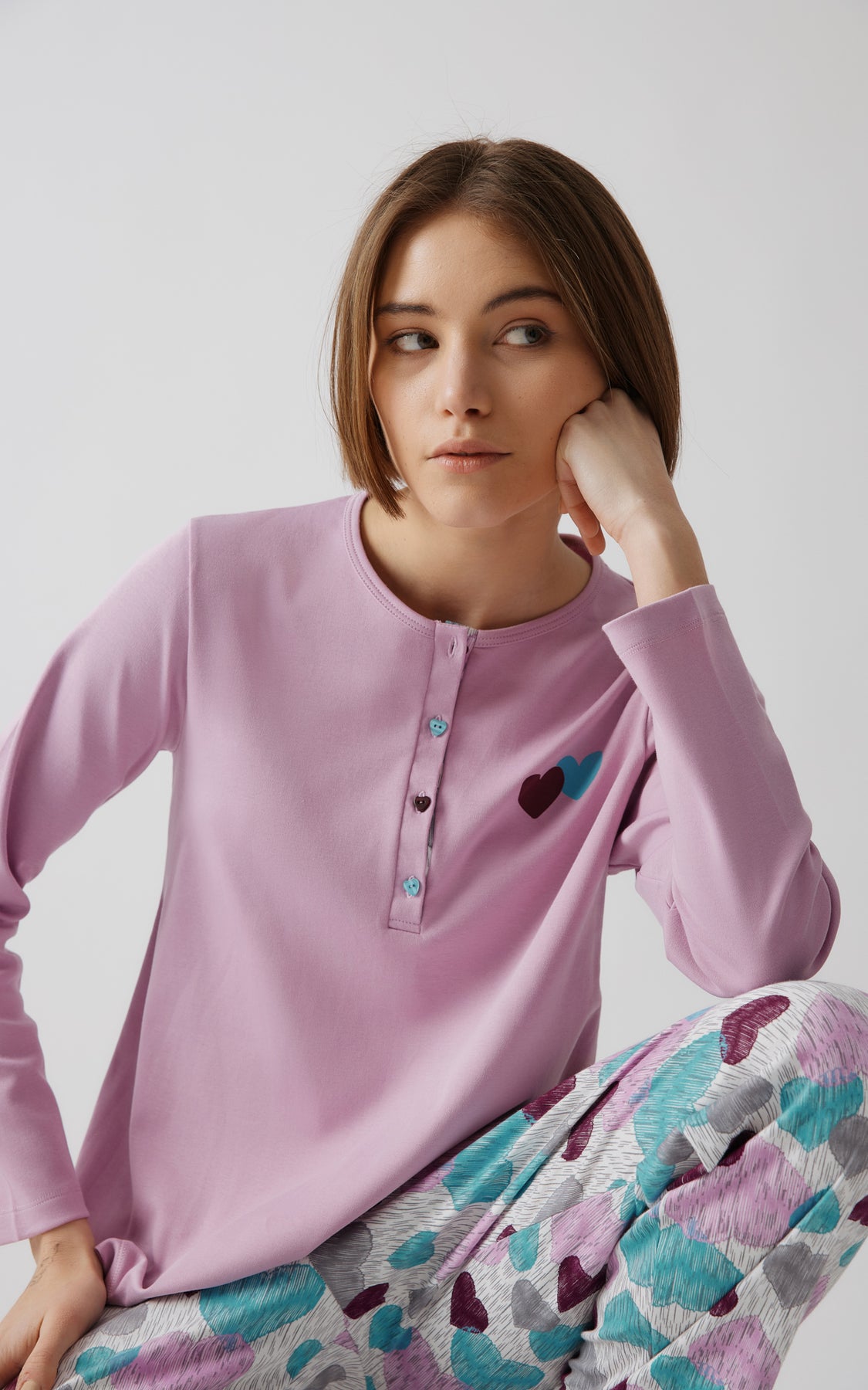 Γυναικεία Πιτζάμα Μωβ Βαμβακερή Με Καρδιές και Κουμπιά Minerva Multi Hearts