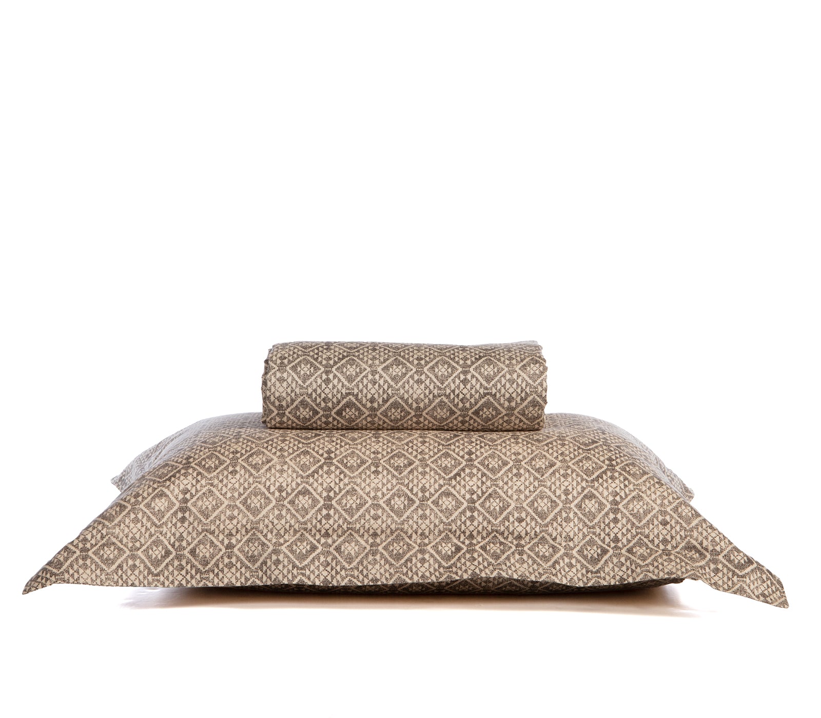 Σετ παπλωματοθήκη υπέρδιπλη σε εμπριμέ σχέδιο με μπεζ και γκρι αποχρώσεις, κατασκευασμένη από βαμβάκι-σατέν, της εταιρείας Nef-Nef Homeware. Το σετ περιλαμβάνει μία παπλωματοθήκη διάστασης 240x230 cm με γεωμετρικό σχέδιο σε αποχρώσεις μπεζ και γκρι στην εξωτερική πλευρά και μονόχρωμη σκούρα καφέ στην εσωτερική. Συνοδεύεται από δύο μαξιλαροθήκες διάστασης 52x72 cm με το ίδιο γεωμετρικό σχέδιο και στις δύο πλευρές. Μια εκλεπτυσμένη επιλογή που θα δώσει στο υπνοδωμάτιό σας ζεστασιά και κομψότητα.Ολοκληρώστε το αποτέλεσμα με σεντόνια και παπλώματα που ενσωματώνονται ιδανικά στην αισθητική του χώρου σας.