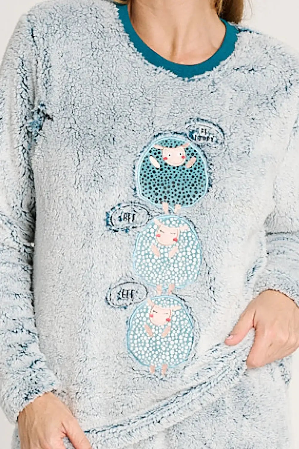 Γυναικεία χειμερινή πιτζάμα της εταιρείας Muy Demi σε γκρι-γαλάζιους τόνους, κατασκευασμένη από απαλό fleece για απόλυτη ζεστασιά. Η μπλούζα με μακρύ μανίκι ξεχωρίζει με το χαριτωμένο ραμμένο σχέδιο προβάτων στο μπροστινό μέρος ενώ το παντελόνι διαθέτει μπάσκες στα τελειώματα που χαρίζουν άνεση και πρακτικότητα, κάνοντάς τη την ιδανική επιλογή για cozy βραδιές στο σπίτι.