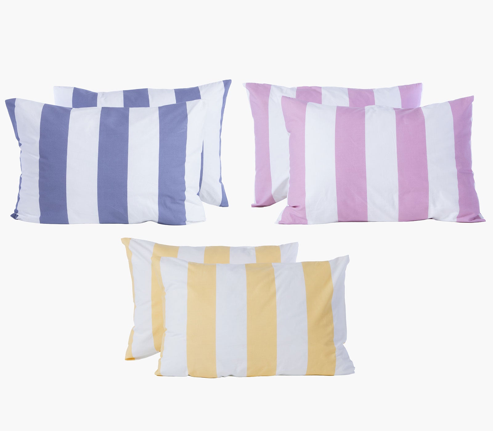 Τρεις μαξιλαροθήκες ύπνου Casual Vertia με ριγέ σχέδιο σε μπλε, ροζ και κίτρινη απόχρωση πάνω σε λευκό φόντο.