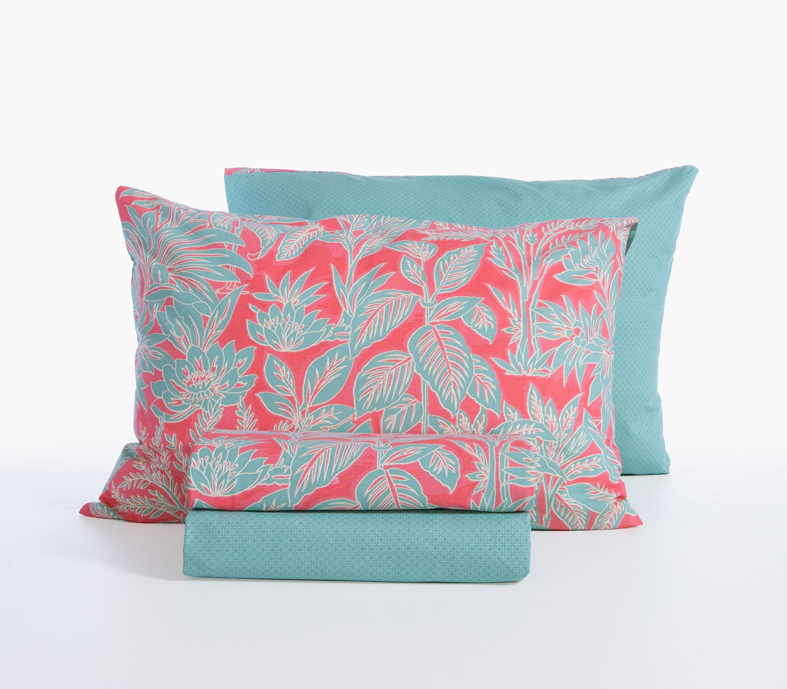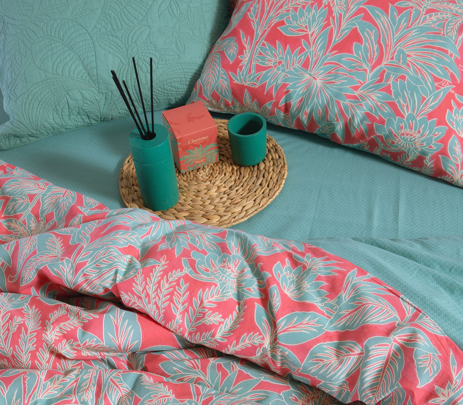 Σετ σεντόνια υπέρδιπλα Charisma σε αποχρώσεις κοραλί και πράσινου της εταιρείας Nef-Nef Homeware. Είναι κατασκευασμένο από 100% βαμβάκι υψηλής ποιότητας που προσφέρει απαλή, φυσική υφή και ευχάριστη αίσθηση στον ύπνο. Το πανωσέντονο σε διάσταση 240Χ270cm διαθέτει εντυπωσιακό φυλλωτό μοτίβο σε πράσινους τόνους πάνω σε κοραλί φόντο, δημιουργώντας μια ζωντανή και καλοκαιρινή αισθητική στο υπνοδωμάτιο, ενώ το κατωσέντονο διάστασης 240Χ270cm είναι μονόχρωμο σε πράσινη απόχρωση. Το σετ ολοκληρώνεται με δύο μαξιλαροθήκες 52Χ72cm που ακολουθούν το ίδιο τροπικό σχέδιο. Συνδυάστε το με διακοσμητικές μαξιλαροθήκες και κουβερλί της αρεσκείας σας για ένα ολοκληρωμένο αποτέλεσμα!