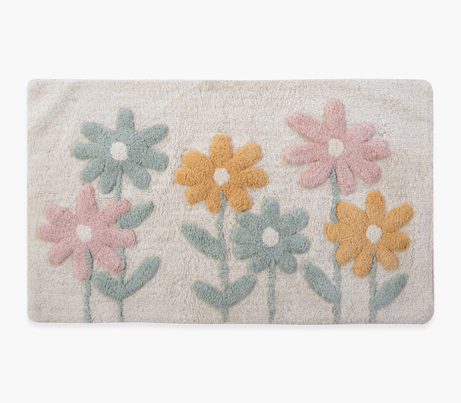 Βαμβακερό ταπέτο μπάνιου σε εκρού χρώμα με ανάγλυφα λουλούδια σε ροζ, βεραμάν και ώχρα πάνω σε λευκό φόντο.
