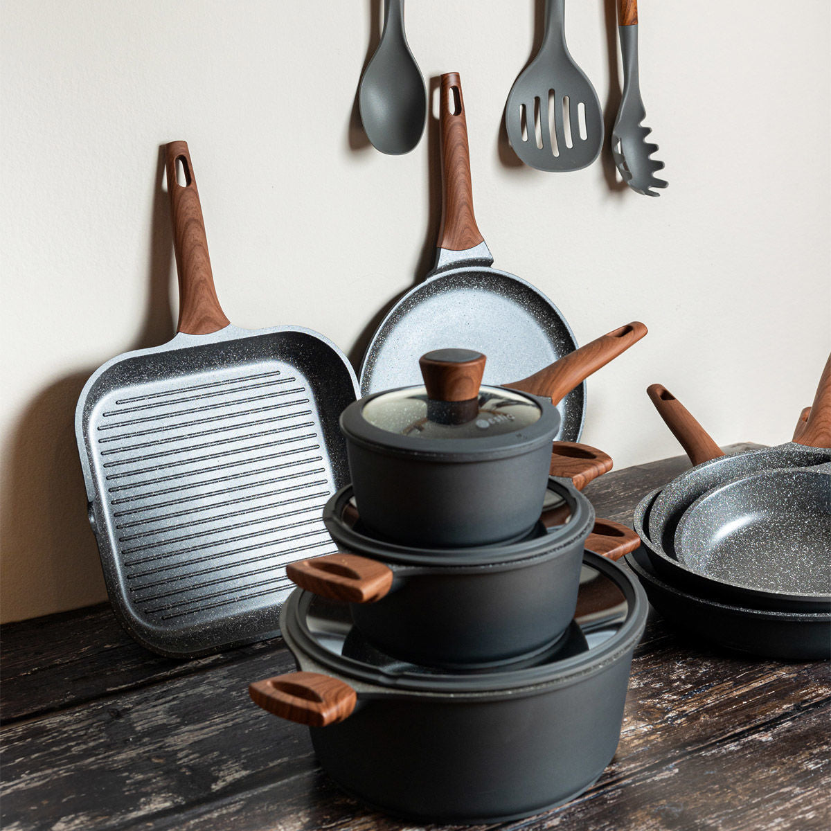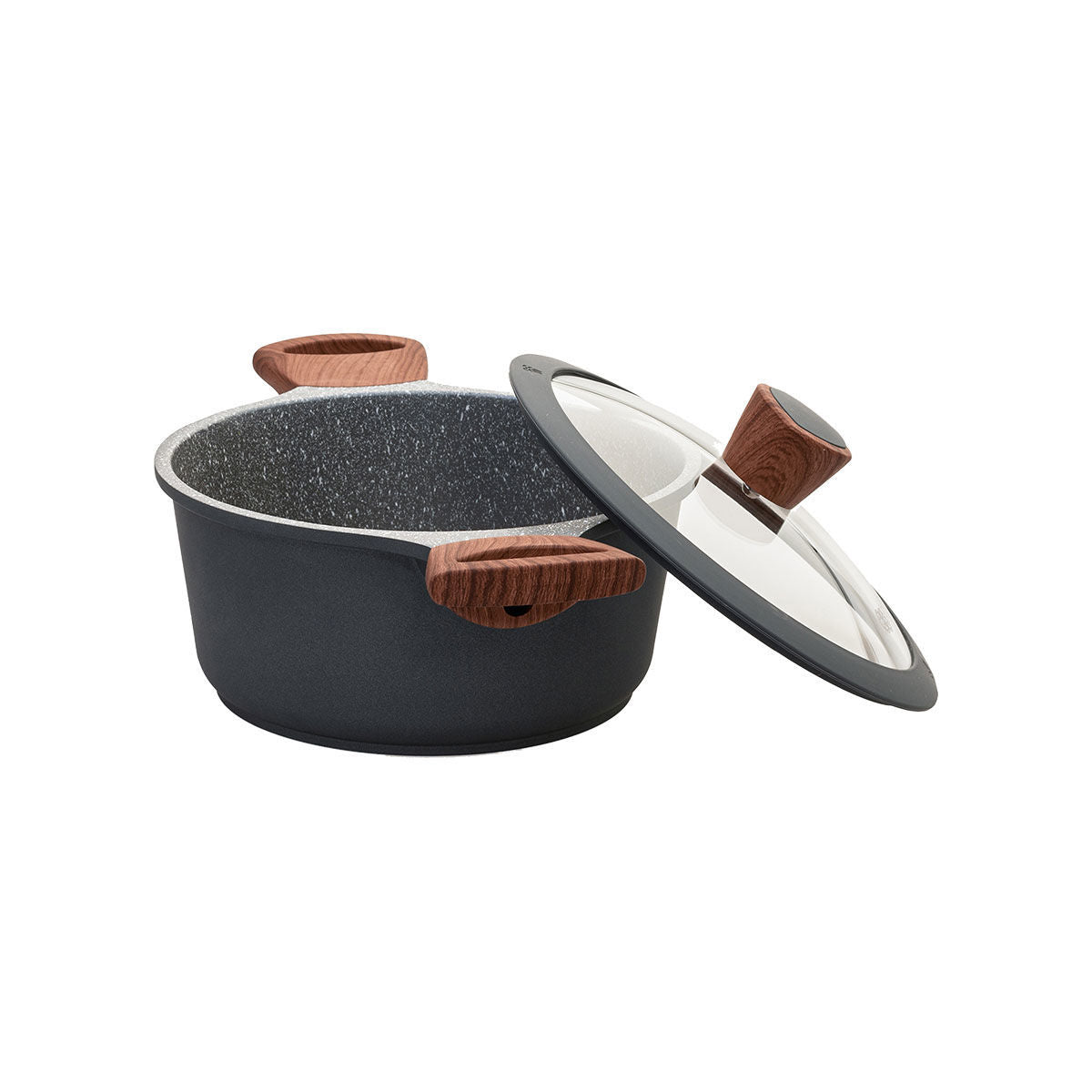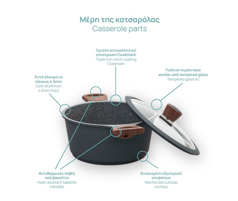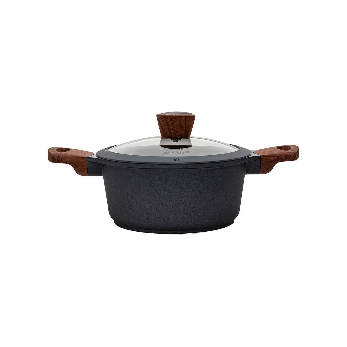 Αναβαθμίστε το καθημερινό μαγείρεμα με την κατσαρόλα Stone Series της Estia, κατασκευασμένη από χυτό αλουμίνιο υψηλής ποιότητας για αντοχή και σταθερή θερμική απόδοση. Η τριπλή αντικολλητική επίστρωση με πιστοποίηση Cookmark προσφέρει αξιόπιστη αντικολλητική δράση και εύκολο καθάρισμα, ενώ η εξωτερική επιφάνεια με όψη πέτρας δίνει φυσικό χαρακτήρα στο σκεύος. Το πυράντοχο καπάκι από tempered glass με στεφάνι σιλικόνης εξασφαλίζει σωστή συγκράτηση θερμότητας και υγρασίας, βοηθώντας στη διατήρηση των θρεπτικών στοιχείων του φαγητού. Οι εργονομικές και αντιολισθητικές λαβές από βακελίτη παραμένουν κρύες για άνετο και ασφαλές κράτημα. Είναι κατάλληλη για όλους τους τύπους εστιών και προσφέρει ομοιόμορφη κατανομή θερμότητας για αποδοτικές παρασκευές. Με 5ετή εγγύηση κατασκευαστή, η σειρά Stone αποτελεί αξιόπιστη και πρακτική επιλογή για κάθε σύγχρονη κουζίνα.